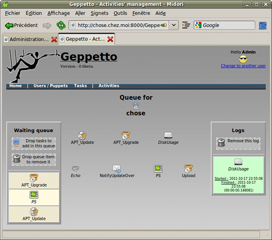 The first page displays the list of all defined puppet with related status. Click on the one you want to manage.
