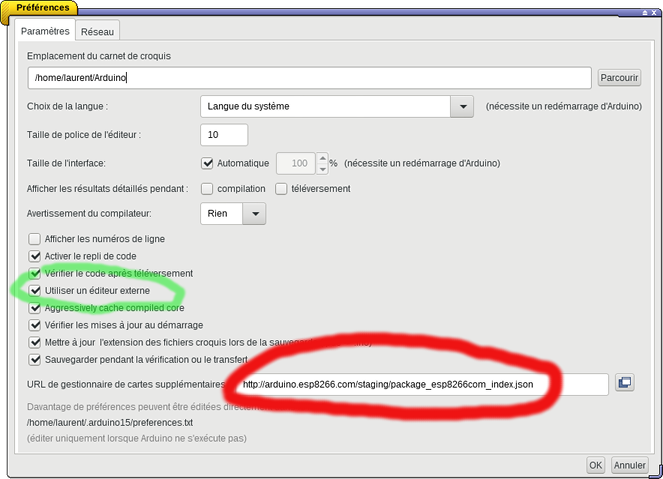 Menu > Fichiers > Préférence : il faut indiquer à l'IDE où trouver les définitions de l'ESP (le cadre rouge).