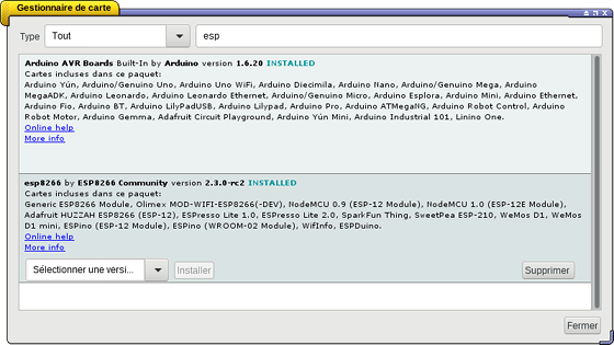 Outils > Type de carte > Gestionnaire de carte : sélectionnez "esp8266" et installer ... patientez quelques minutes, minutes qui dépendront de la rapidité de votre ligne ADSL et de votre machine (ha, java).