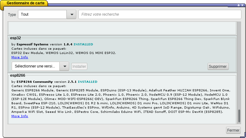 Outils > Type de carte > Gestionnaire de carte : sélectionnez "ESP32 by Espressif Systems" et installer ... patientez.