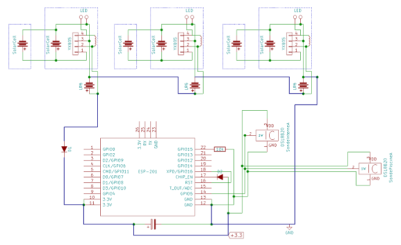 Malheureusement, les accus ne se sont jamais rechargés le lendemain : comme cela fonctionne parfaitement pour les loupiotes seules, je pense que c'est l'ESP qui est fautif. J'ai lu sur le Web que face à de très basse tension, son étage WIFI pouvait consommer énormément jusqu'à griller. Vu le peu d'intensité délivrée par les cellules, pas vraiment de risque, mais il va me falloir trouver une solution pour déconnecter l'ESP jusqu'à une tension suffisante.