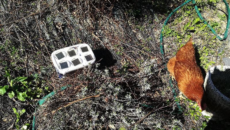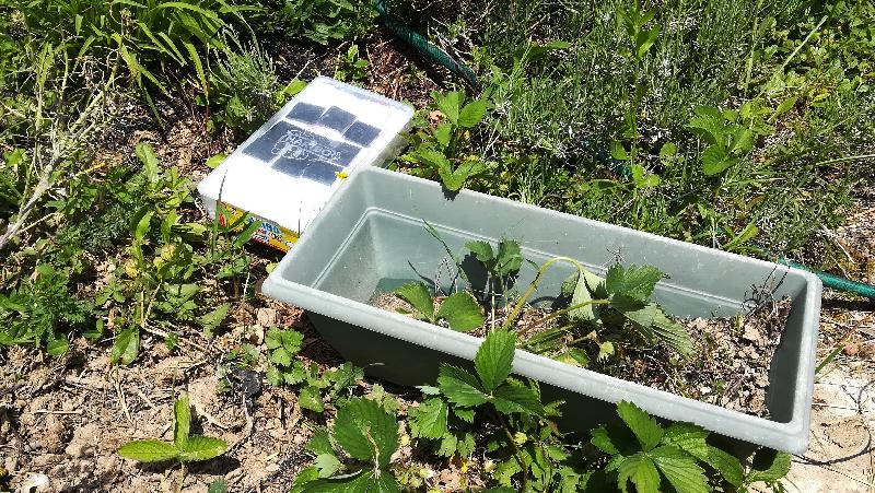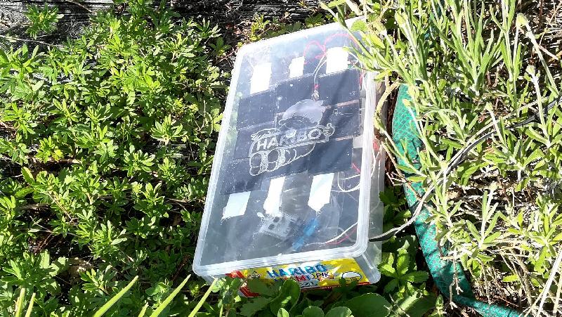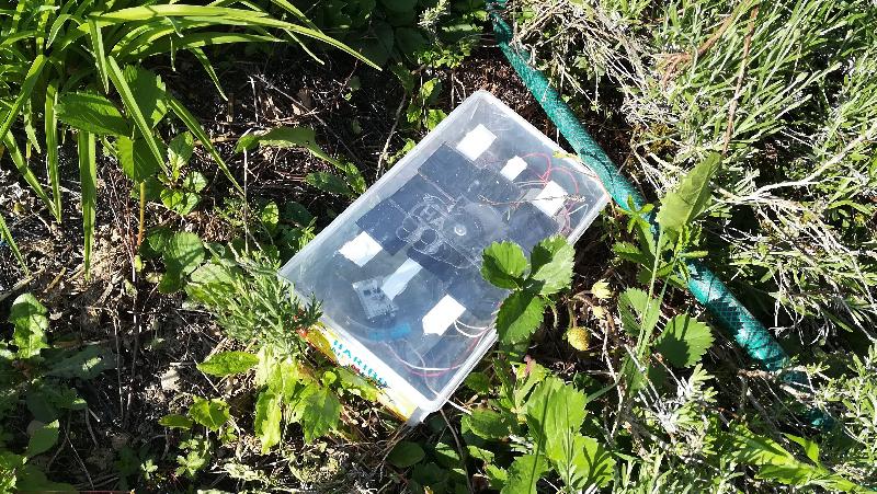 Et voilà la sonde en situation : ce n'est clairement pas des plus esthétiques ... mais ça n'a pas beaucoup d'importance pour le moment : ce n'est que du test. Pour une installation définitive, il faudrait sans doute peindre la boite version camouflage, la noyer dans la végétation en s'assurant quand même de la bonne exposition des cellules.