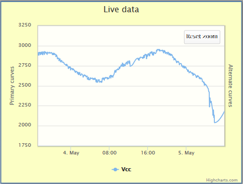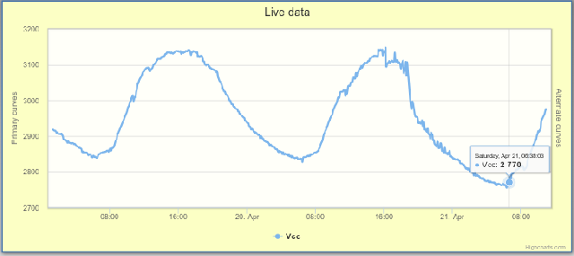 Petit retour après quelques jours de fonctionnement avec échantillonage toutes les 5 minutes : Et bien, pour un PoC, ça fonctionne plutôt pas mal ! Avec une journée ensoleillée, la sonde envoie ses données toutes les 5 minutes, y compris la nuit. Cependant, la chute de tension reste relativement importante (environ 0,4 V ... mais n'oublions pas que les accus ont déjà bien vécus) et la charge semble grandement affectée par la température.
