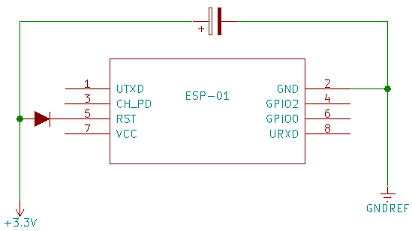 Pour éviter ce problème, j'ai mis une diode entre le VDD et la broche CH_PD : La tension de seuil de cette dernière fera que l'ESP ne démarrera que lorsque la charge du condensateur sera suffisante.