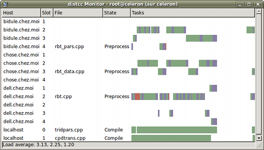 Actuellement, distcc ne fait pas de loadbalancing et alloue les tâches dans l'ordre de la liste fournie à distcc-config. Ici, chargera d'abord bidule, puis chose en enfin la machine locale. Si une machine n'est pas joignable, pas de problème, c'est la machine locale qui prendra le relais.