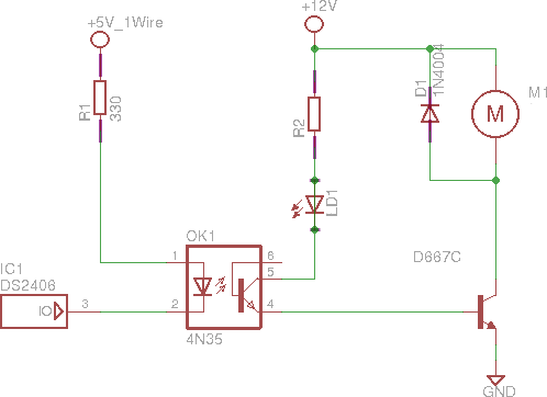 L'opto-coupleur 4N35 permet une séparation galvanique entre le 12v et notre bus 1-wire. Sur la toile, on trouvera d'autres schémas où le DS2406 attaque directement l'étage de puissance, mais cette séparation est plus sécurisante ... et comme j'avais cet opto sous la main, récupéré d'un écran HS ...