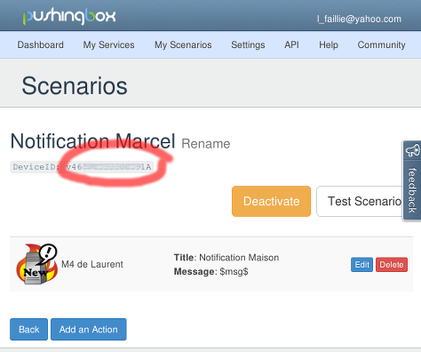 Dans "my scenarios", on associe le service à un "virtual scenario" dont le message est une variable nommée msg. A noter le DeviceID qui identifie le scénario : c'est l'argument qui sera passé au webservice.
