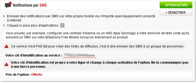 Il faut donc se rendre dans l'espace abonné et activer l'option "Notification par SMS" : le site fourni alors une clef unique et individuelle qui donne accès au service mais identifie aussi le mobile sur lequel le SMS doit être envoyé (donc en clair, une clef == un numéro).