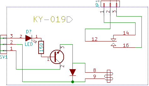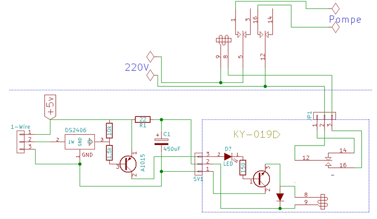 L'interfaçage avec le bus 1-wire se fait donc avec un DS-2406 déjà décrit. Sa sortie est mise à la masse lorsqu'elle est activée et comme le KY-19D attend une tension pour être excité, un transistor PNP inverse ce signal.