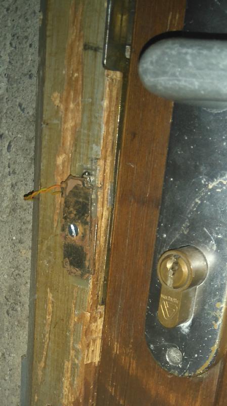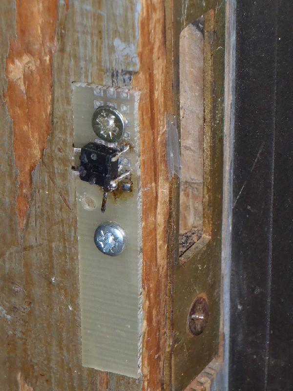 Pour la serrure, ce n'était plus possible par manque de place et pour éviter de trop charcuter la boiserie. J'ai donc utilisé un petit poussoir d'un panneau de contrôle d'un écran lui aussi HS. Le problème est que sa course est vraiment ridicule (moins d'un demi-millimetre) : lorsque le pêne est fermé, une feuille de plastique semi-rigide appui ... sur un bout de fil lui rigide qui pousse alors sur le bouton. C'est franchement de la bidouille hardcore, ça demande un réglage pointilleux et l'un dans l'autre, ça ne fonctionne que lorsque la serrure est fermée à double tour (sinon, sa course n'est pas suffisante). Sans changer le mécanisme, je n'ai pas trouvé mieux et ça fonctionne ... pour le moment.