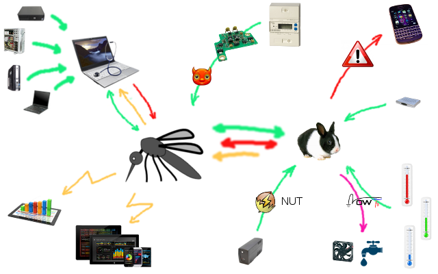 Différents démons collectent les données de la maison qui seront consommées par autant de clients que nécessaire sans que cela n'influe sur les performances du serveur ou du réseau.