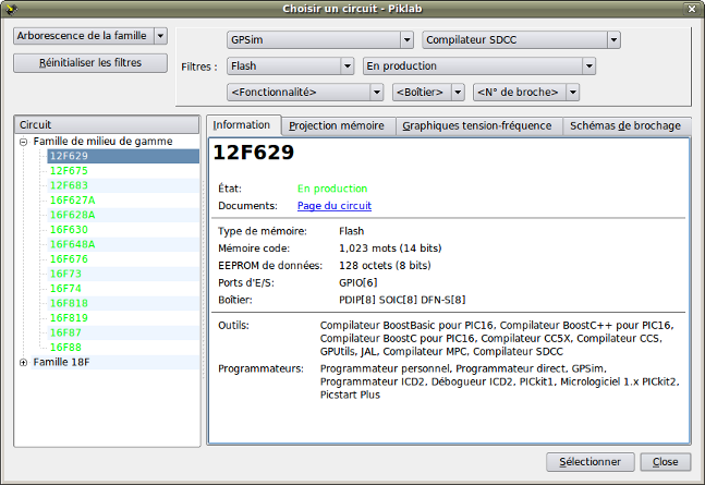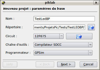 Première étape : lancer Piklab, puis on utilise le menu "Projet/nouveau projet". Un popup s'ouvre dans lequel on spécifie les paramètres du projet.
