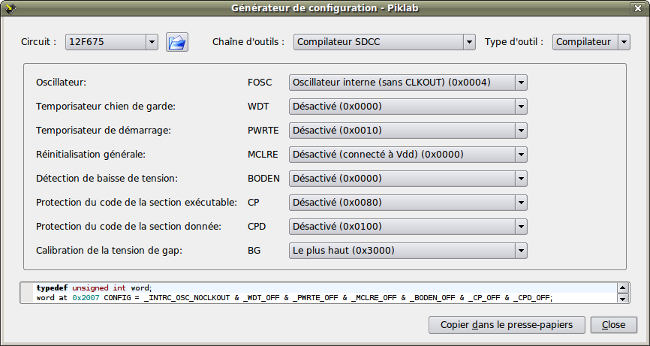 word at 0x2007 CONFIG = _INTRC_OSC_NOCLKOUT & _WDT_OFF & _PWRTE_OFF & _MCLRE_OFF & _BODEN_OFF & _CP_OFF & _CPD_OFF;