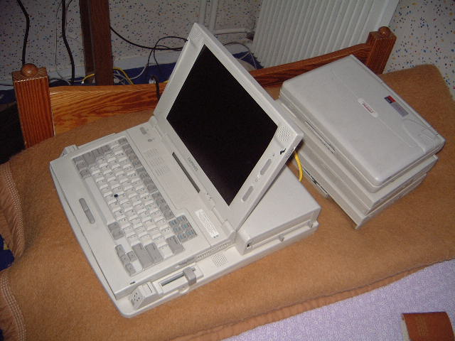 J'ai aussi récupéré la station d'accueille que l'on voit sur la photo. Elle dispose d'un contrôleur SCSI (inutilisé) et une interface Ethernet. Malheureusement, contrairement au 486, elle est équipée de connecteurs propriétaires J'ai récupéré plusieurs machines de ce genre. On en voit quelques unes sur la photo. Disques à ma disposition: