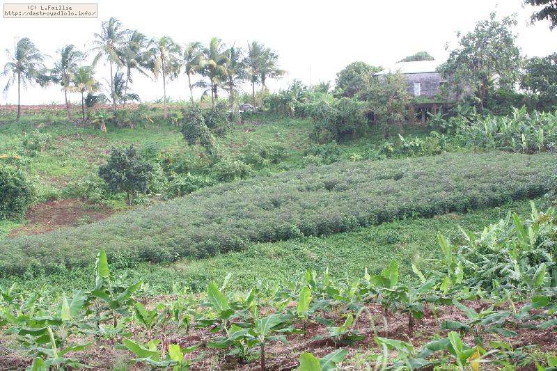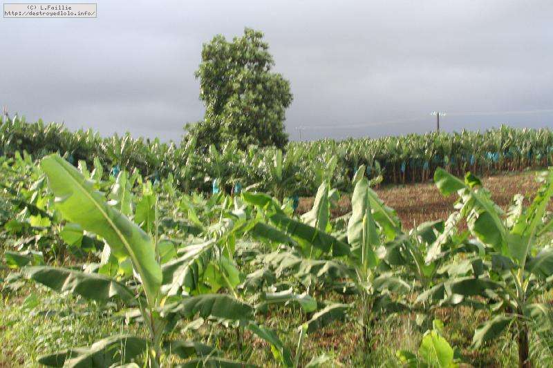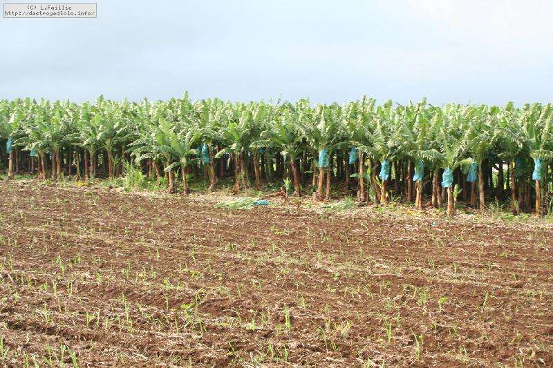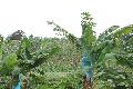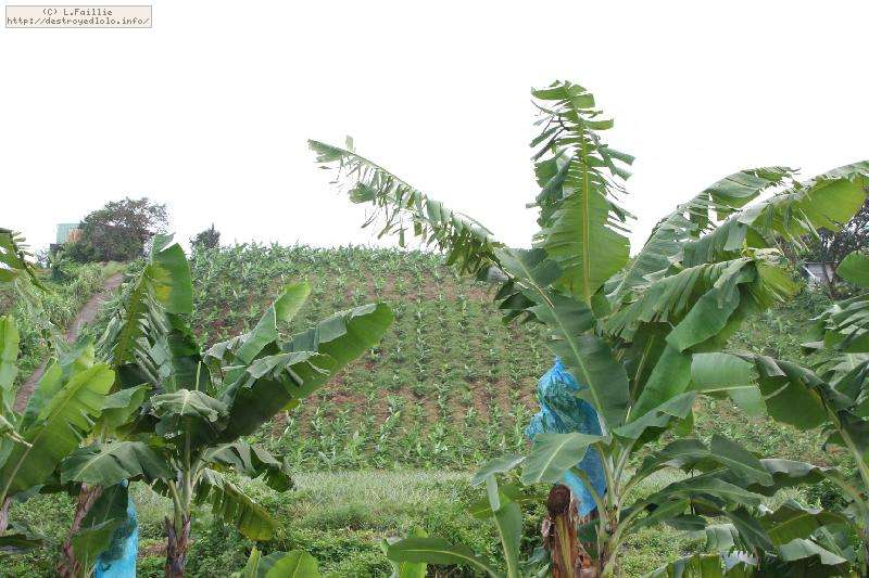 Pour protéger les fruits des insectes, des oiseaux et des rongeurs, les régimes sont entourés de grands sacs bleus (à l'esthétisme douteux, il faut bien l'avouer), ce qui permet par la même d'accélérer leur maturation. On notera aussi quelques régimes qui ont été coupés et laissé au pied des plantes : ils ont été sacrifiés pour les rongeurs qui trouvent ainsi leur pitance sans devoir s'attaquer aux plans eux-même.