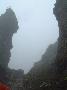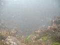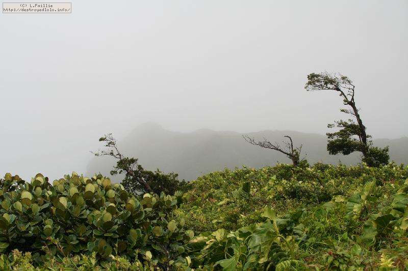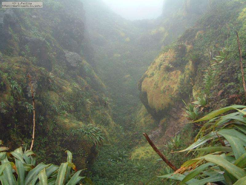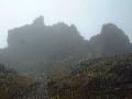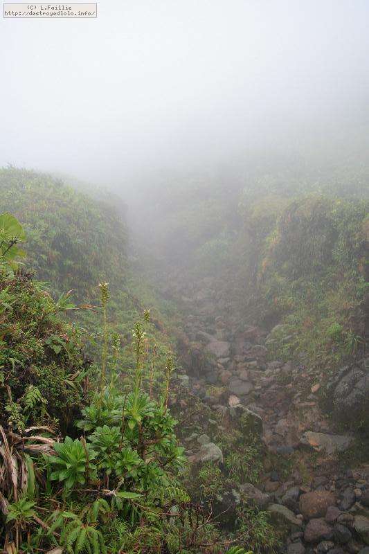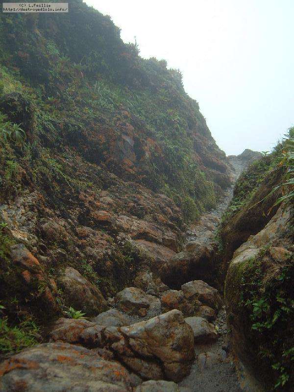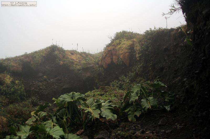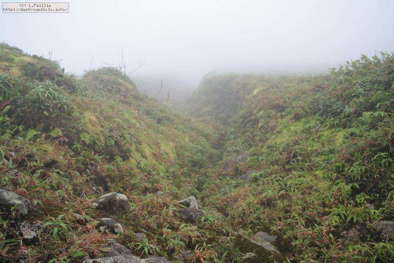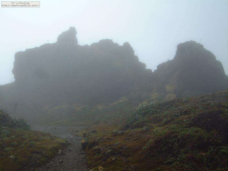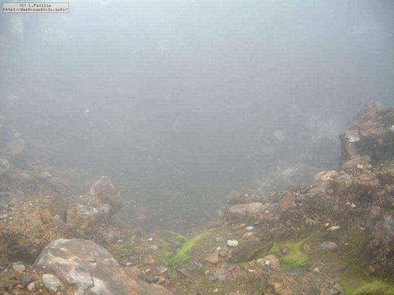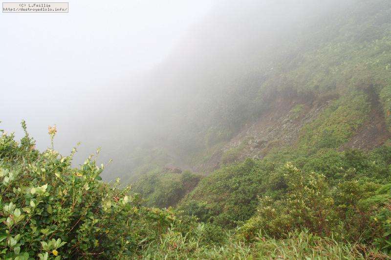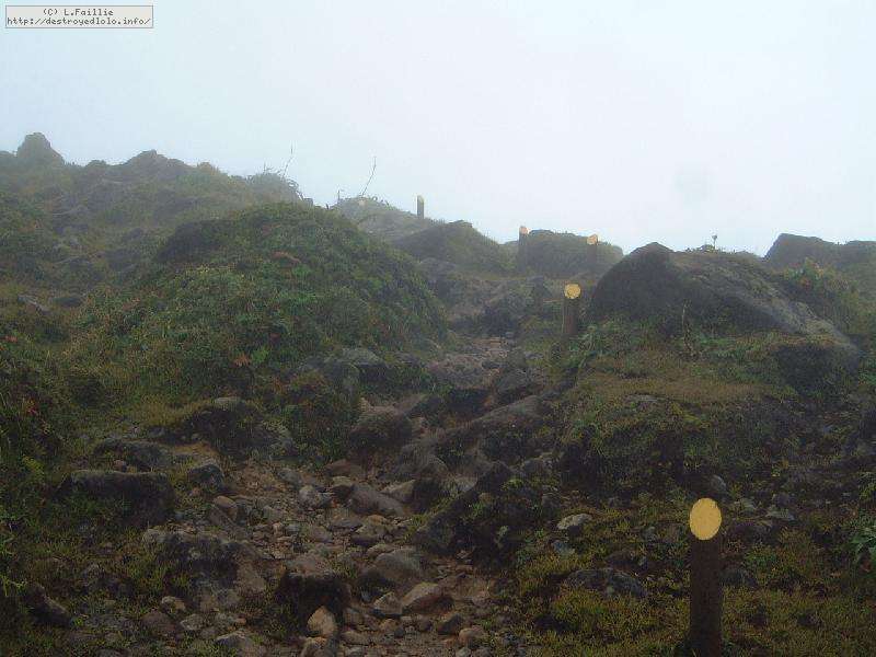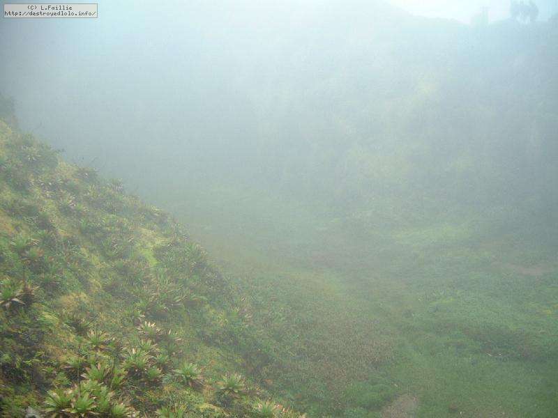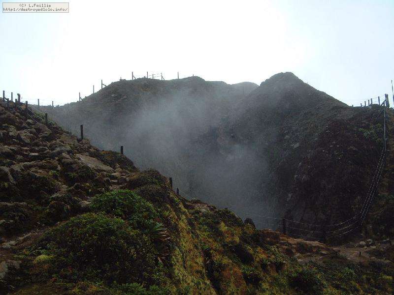 On arrive enfin au sommet toujours dans un omniprésent brouillard, ce qui renforce encore le côté désolé du lieu. Un sentier est balisé et permet d'éviter de se perdre, car la visibilité est du genre réduite. Il n'y a pas de cratère à proprement parlé, mais une succession de gouffres d'où s'échappe une forte odeur de souffre accompagnée de bouffé de chaleur : c'est vraiment un autre monde.