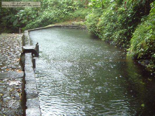 C'est à la descente que les choses se sont compliquée, car nous nous sommes pris LA pluie tropicale des familles. Bien qu'aux premières gouttes nous nous sommes précipités sur nos ponchos, ça n'a pas fait illusion bien longtemps, car en moins de 2, nous nous sommes retrouvés entièrement trempés, des pieds à la tête. Pas un centimètre de sec, même les pompes de rando ont reçu. Et rien de tel qu'un petit plongeon dans les bains jaunes d'une température excise et trempé pour trempé, on a laissé nos maillots bien au sec dans la voiture. Ha la la, on y est resté un bon moment et ça a été très dur de se motivé de sortir de l'eau.