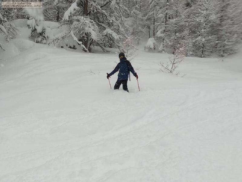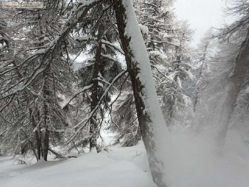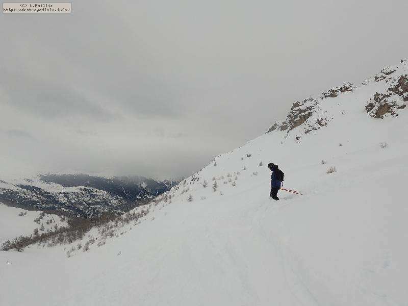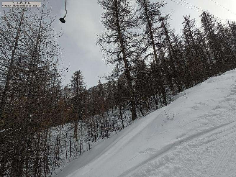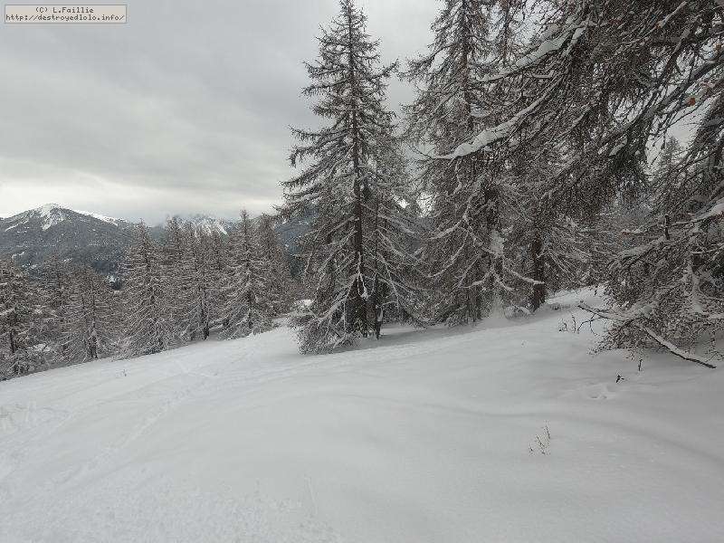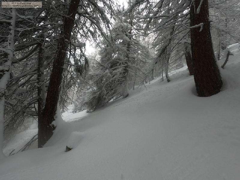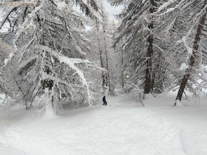 Sur le bas, la neige devient plus compacte (mais reste excellente), mais sous les mélèzes et sur les hauteurs, toujours une peuf comme on l'aime. Et en plus, sous un soleil voilé contrairement aux nuages que la mère théo annonçait ... Ils arriveront en milieu de journée et avec parfois jour blanc.