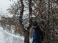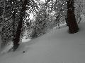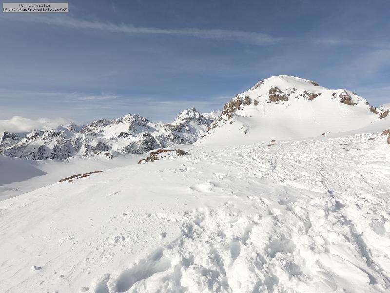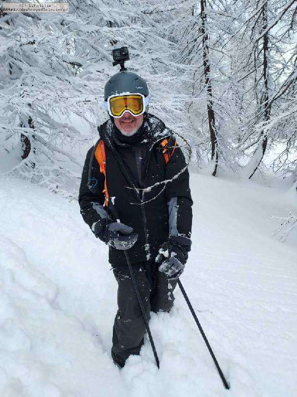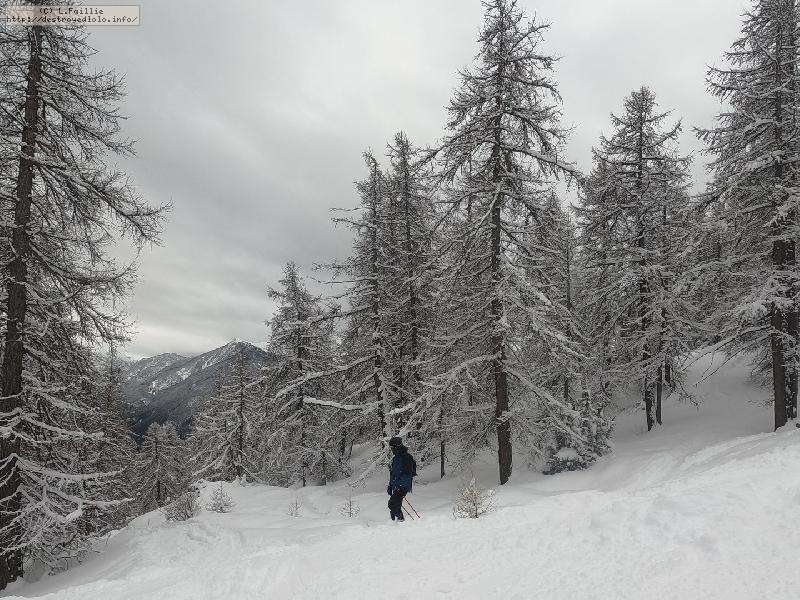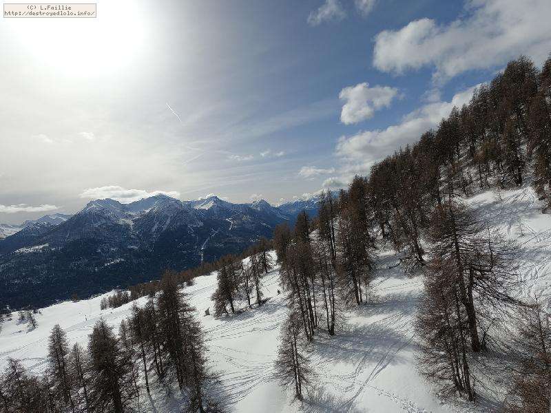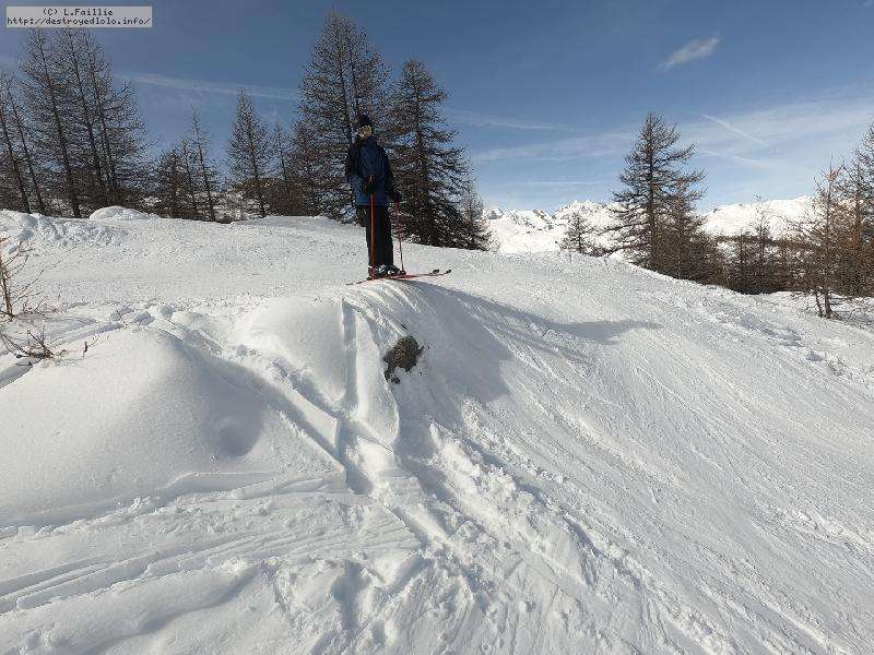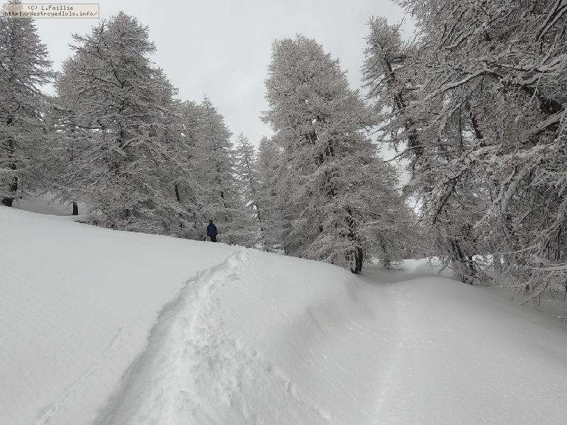Sur le bas, la neige devient plus compacte (mais reste excellente), mais sous les mélèzes et sur les hauteurs, toujours une peuf comme on l'aime. Et en plus, sous un soleil voilé contrairement aux nuages que la mère théo annonçait ... Ils arriveront en milieu de journée et avec parfois jour blanc.