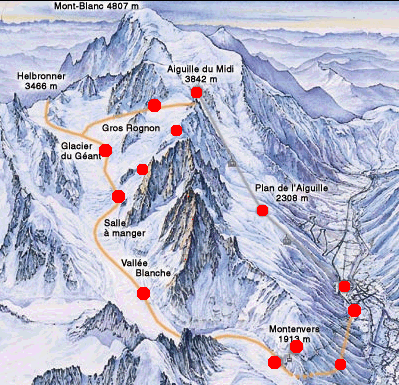 midi jusqu'à la mer de glace, il y a 20 km dont un bon tiers se déroule au dessus de 3000m. Comme je le disais