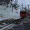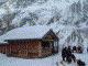 C'est loin de n'être qu'une partie de plaisir : comme pour la descente par le train, il faut déchausser pour monter jusqu'au chalet que l'on voit sur la crête droit devant. Ca prendra une bonne 20ene de minutes, et même si c'est moins pentu que l'escalier, c'est aussi crevant car nous empruntons un sentier creusé au fil des passages dans la neige où la glace.