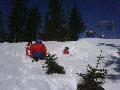 La neige est de la soupe, mais ça ne gène personne : Tous le monde s'éclate dans les champs de bosses sur le coté des pistes ... Célia le fait même au propre comme au figuré avec un joli vol plané, heureusement sans gravité.