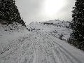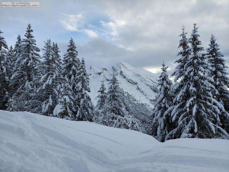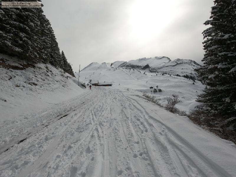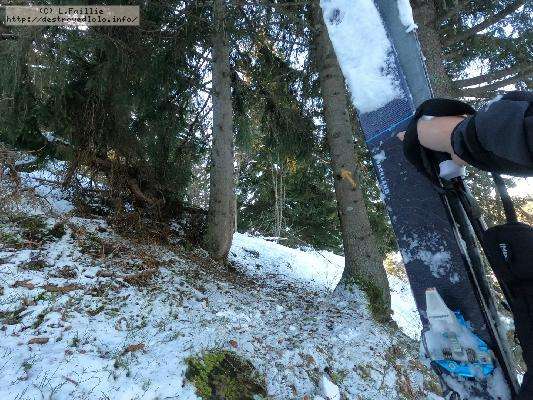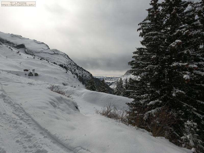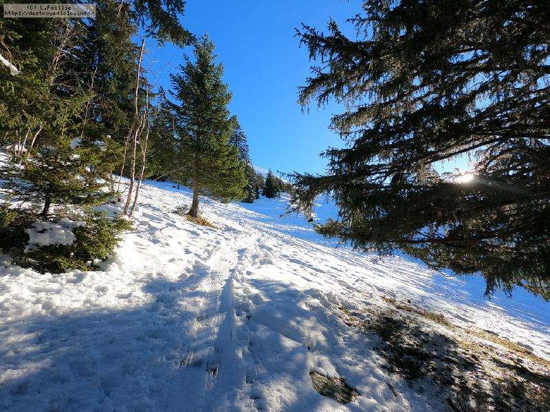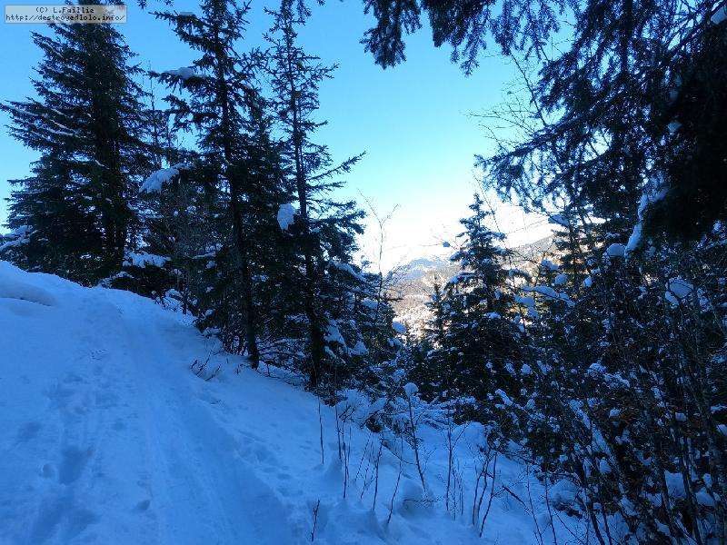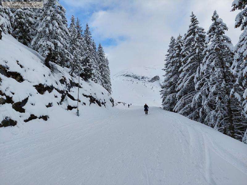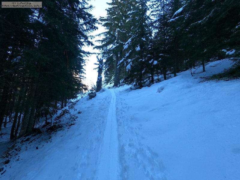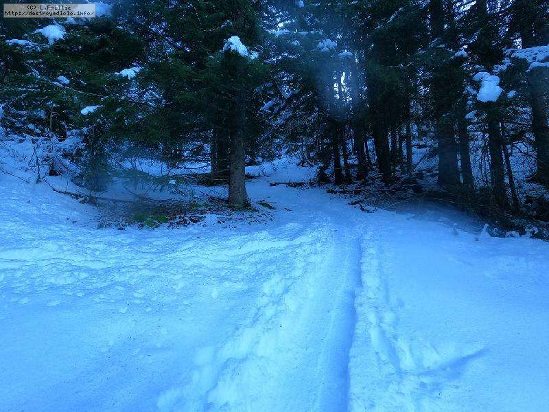 Contre, toute attente, la neige est vraiment pas mal, y compris en suivant la trace sous les sapins : tant mieux, car il y a énormément de randonneurs sur le domaine skiable (encore fermé).