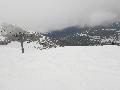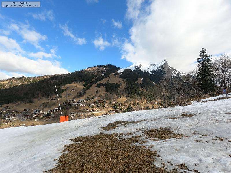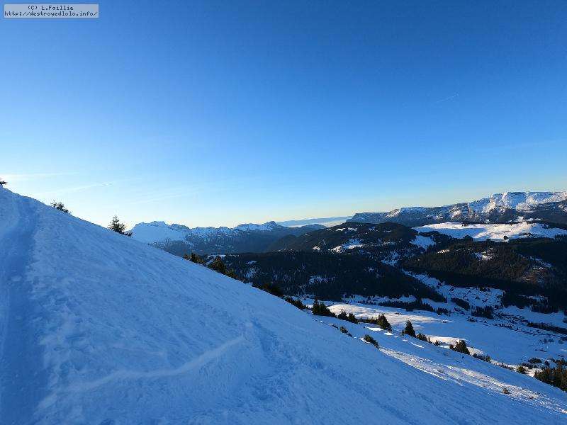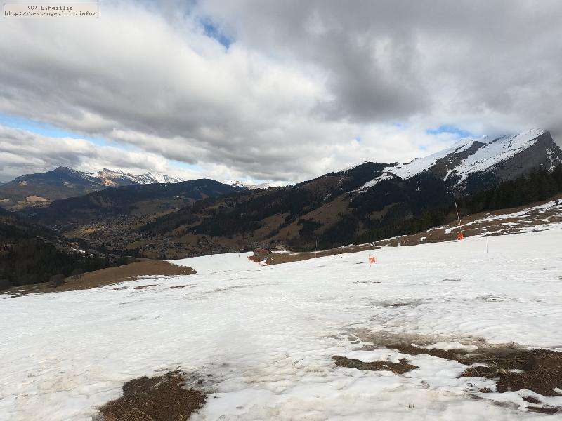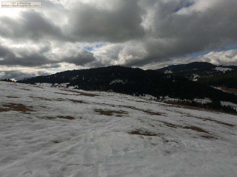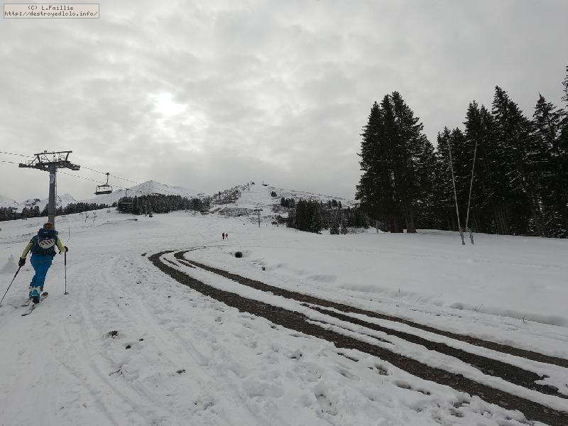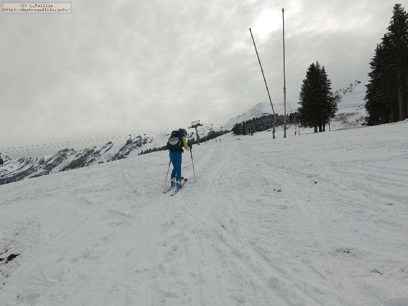 Départ du crét du Merle ... qui était encore vert il y a 2 jours. Évidemment, les requins ne sont pas loin ... mais la neige est bien compacte à 1500m ce qui limite les dégâts. Rapidement, la couche s'épaissit, mais le chemin où est tracée la bleue du Dahu est en pierre : faut bien viser !