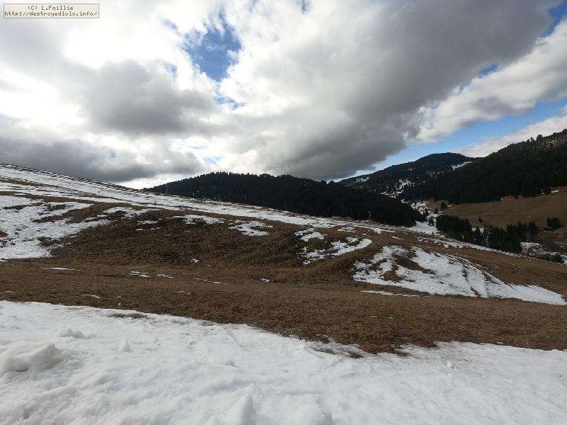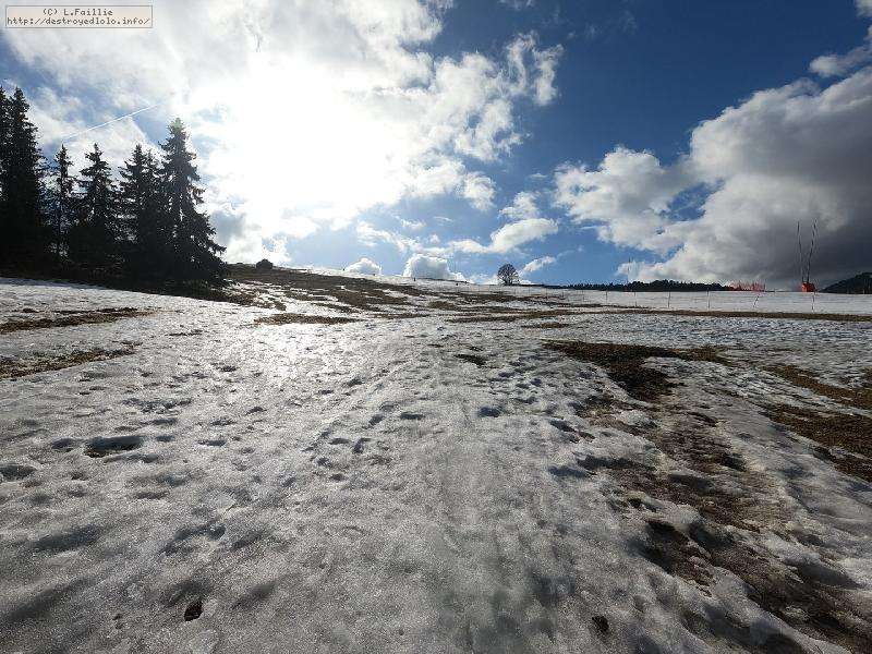 Départ depuis le parking des juments (1220m) ... et là, on peut remercier les cannons : c'est tout vert en dehors des pistes, parsemé de rares névés glacés. C'est bas et la terre commence à bien apparaitre par-ci par-là.