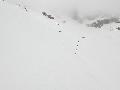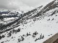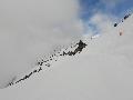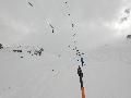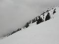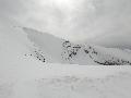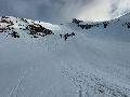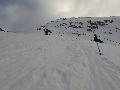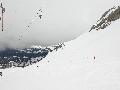 Je finis au col au-dessus de l'arrivée des sièges : neige très mouillée ! Je n'irai pas jusqu'à la pointe de Merdassier, 100m plus haut, car, plus de jambe et surtout, la neige n'a pas l'air stable du tout, des coulées de surface partout.