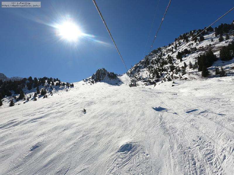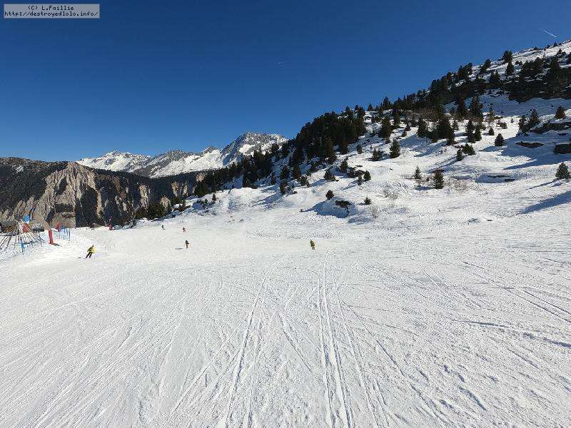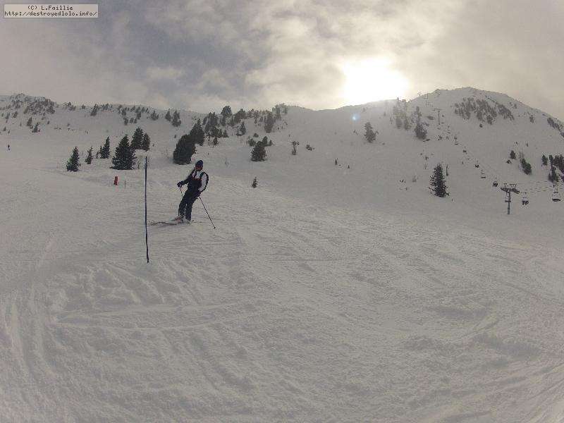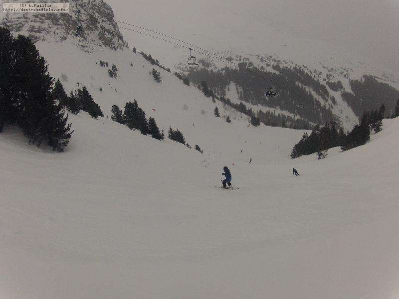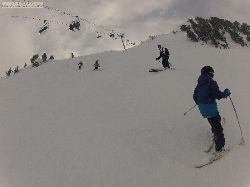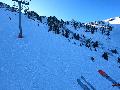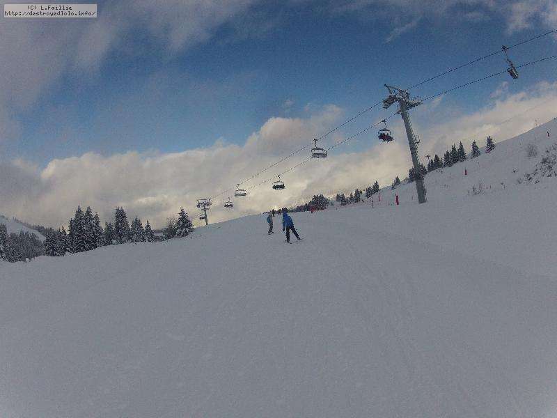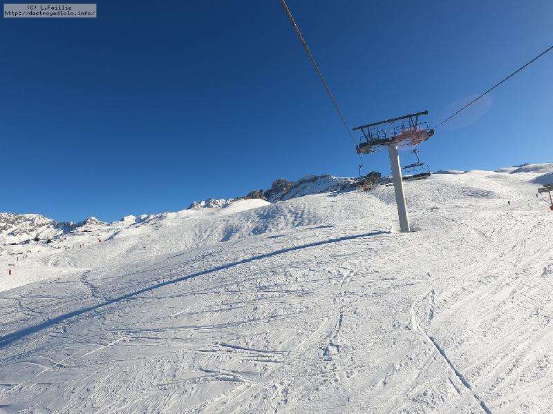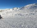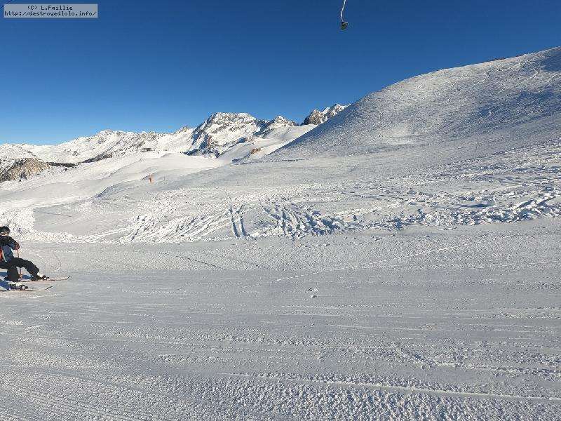 Les pistes sont bien préparées, agréables à skier et le carrelage n'apparaitra vraiment qu'en début d'après midi : il faut dire qu'il y a du monde, beaucoup de monde, et les touristes raclent pas mal. Mais heureusement, les pistes sont assez larges pour échapper aux collisions. N'empêche qu'on verra quand même quelques barquettes : les vacances commencent mal pour certains.