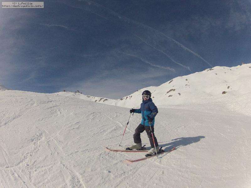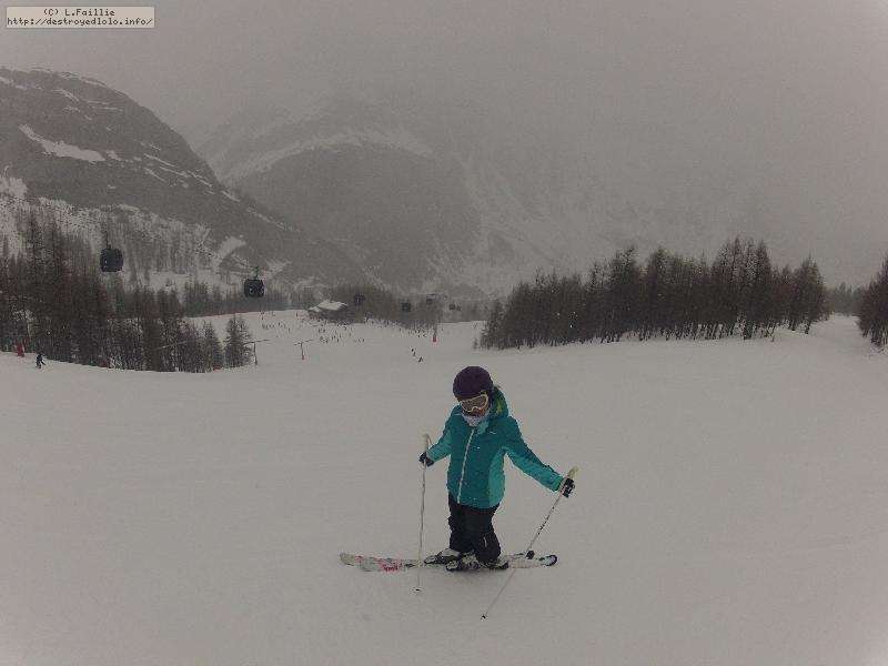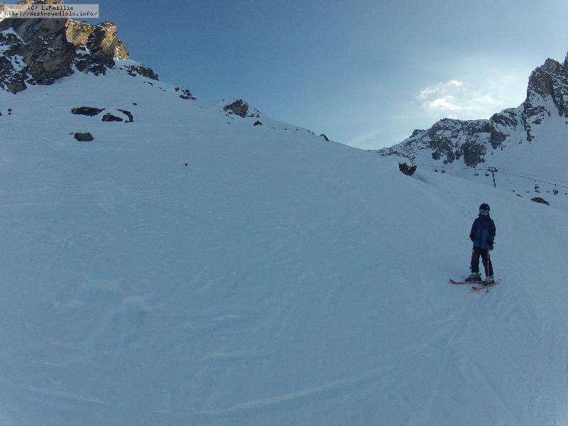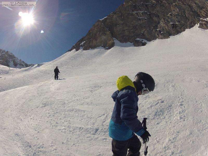 Après avoir fait aussi les OK et Orange, nous voici sur la Face de Bellevarde. Si le haut a une très bonne neige, le dernier raidillon est bien évidemment verglacé avec des monticules de soupe dûs fait du passage. Si Papa apprécie, "de la merdasse" pour Océane.