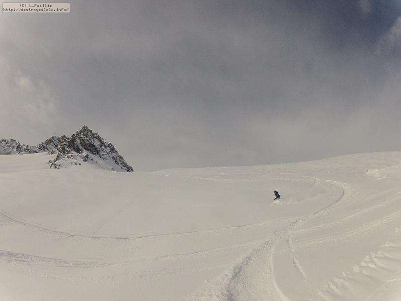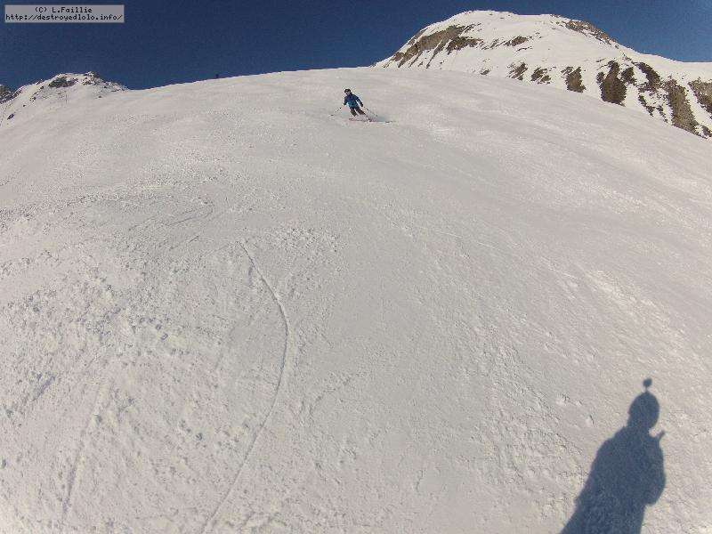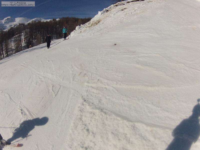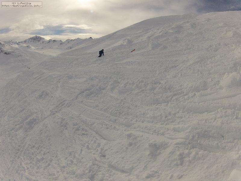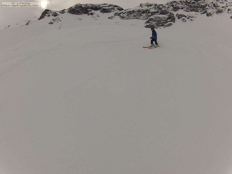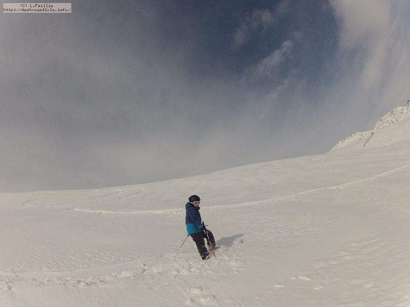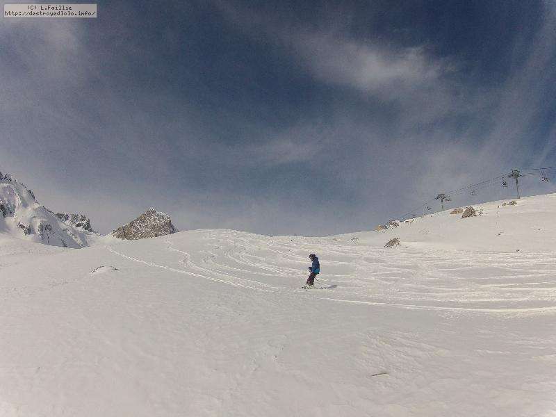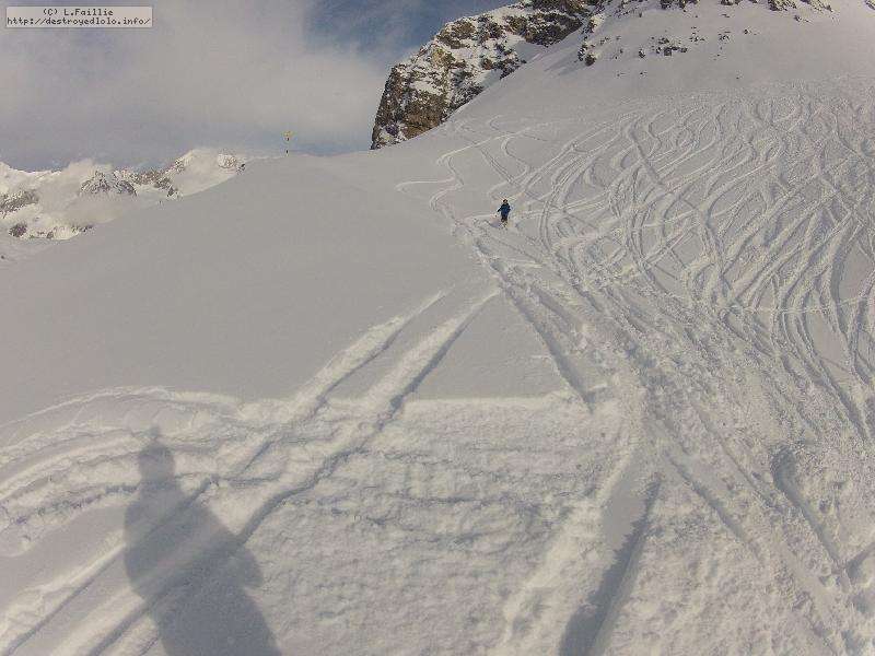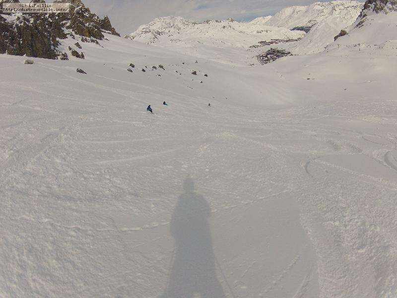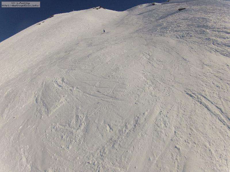 Et là, c'est le drame : le soleil est revenu, un grand champs de peuf VIERGE devant papa qui descend à fond et ... crack !!! Il n'y avait qu'un seul rocher, bien caché sous la peuf (au moins 30 cm grâce au vent)