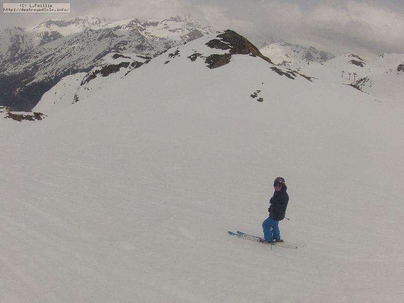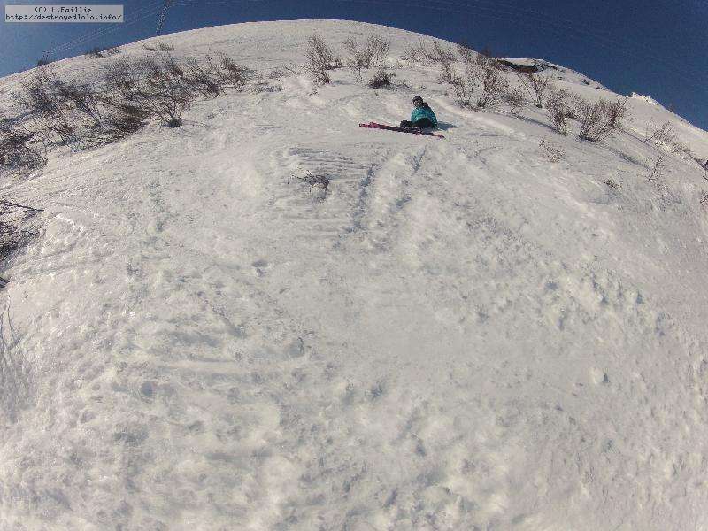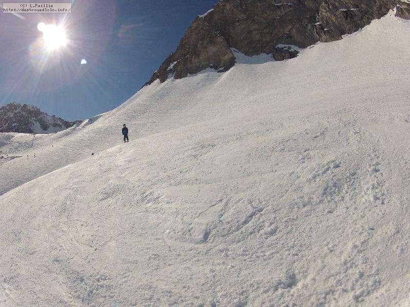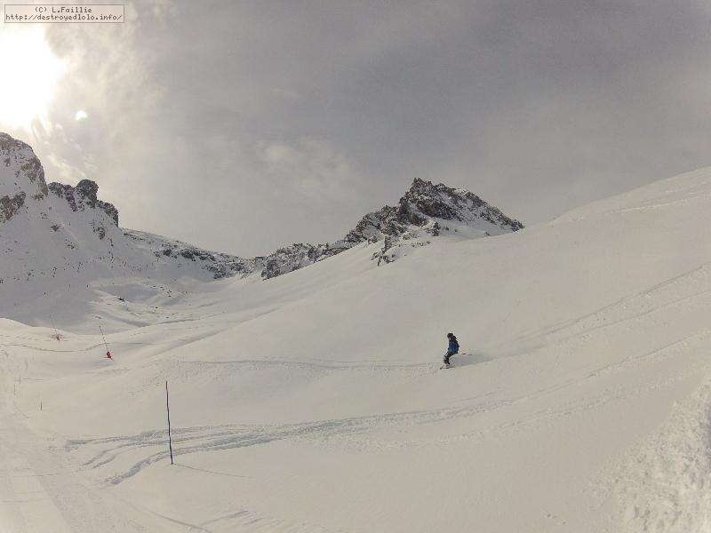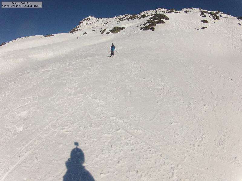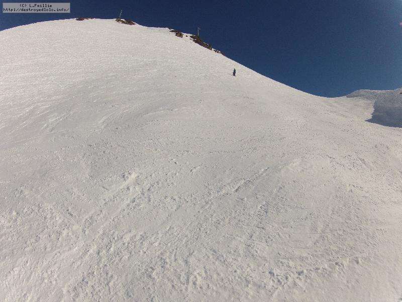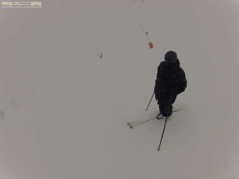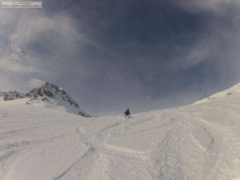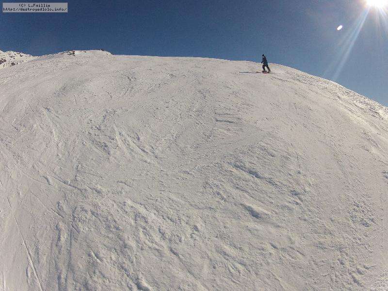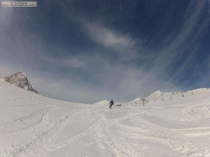 Et là, c'est le drame : le soleil est revenu, un grand champs de peuf VIERGE devant papa qui descend à fond et ... crack !!! Il n'y avait qu'un seul rocher, bien caché sous la peuf (au moins 30 cm grâce au vent)