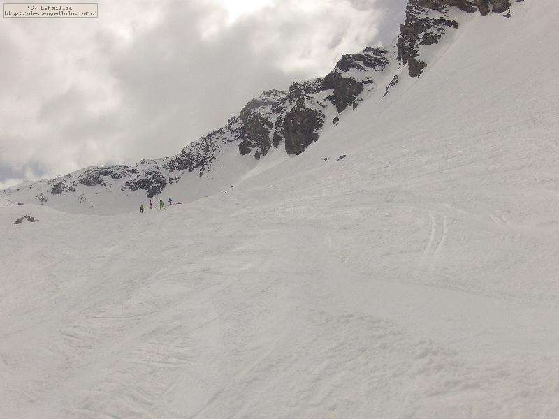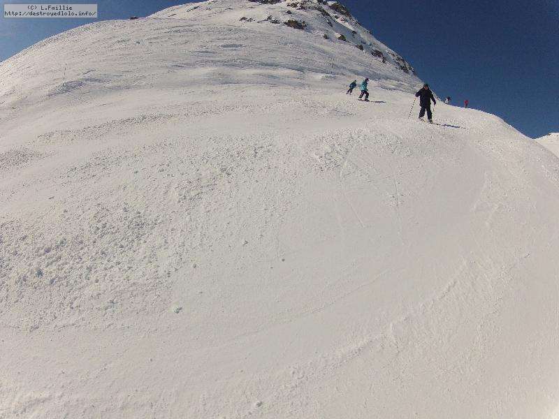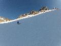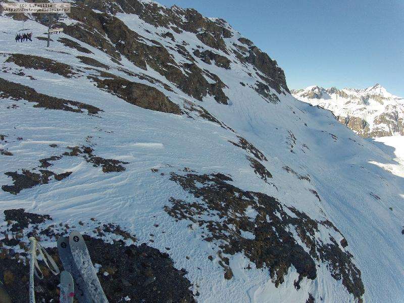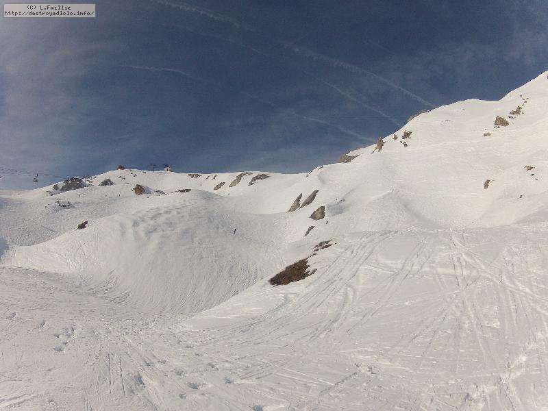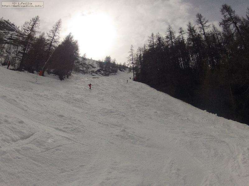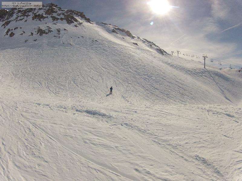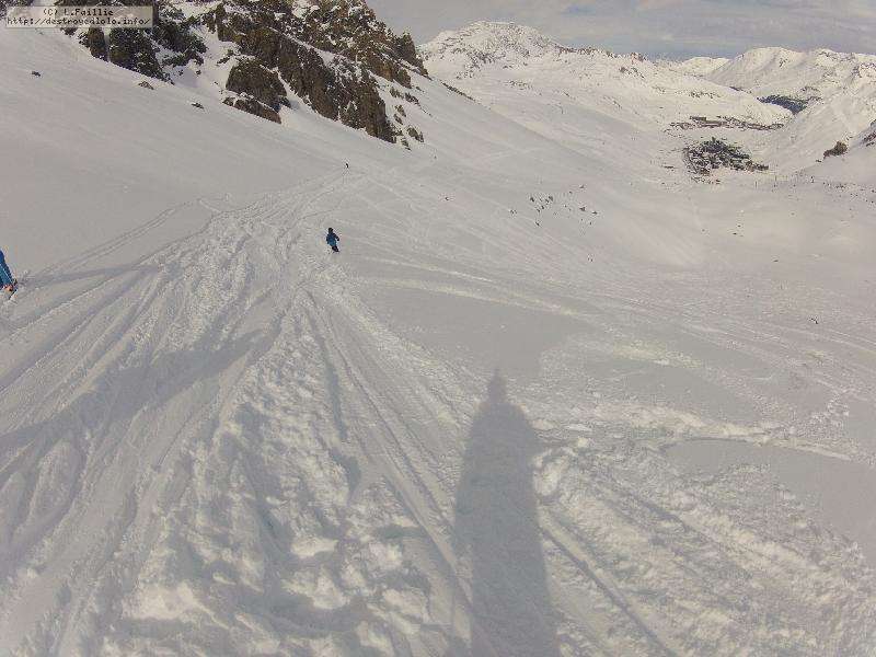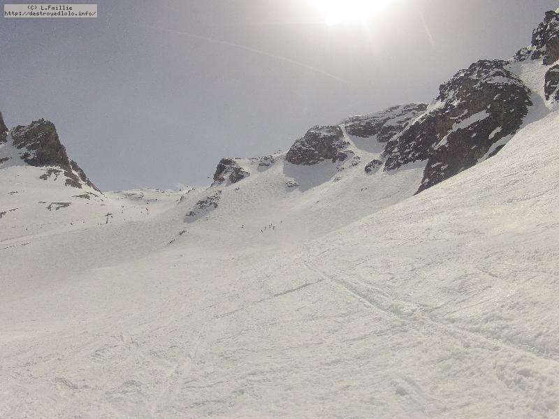 Direction "Signal", une grande rouge rectiligne et bien pentue : pas grand intérêt ... Quittons-la pour prendre le goulet lui aussi relativement pentu qui se trouve sous le télésiège Pyramide : une hors-piste très couru.