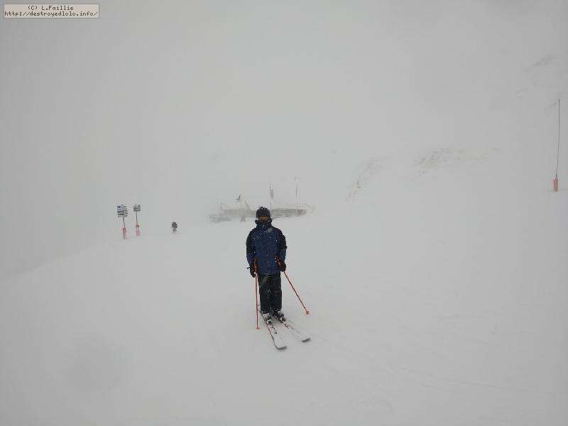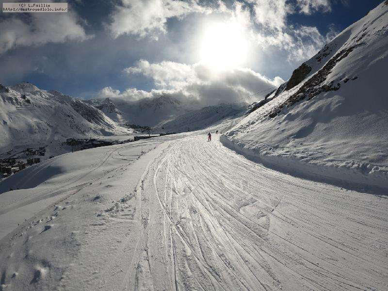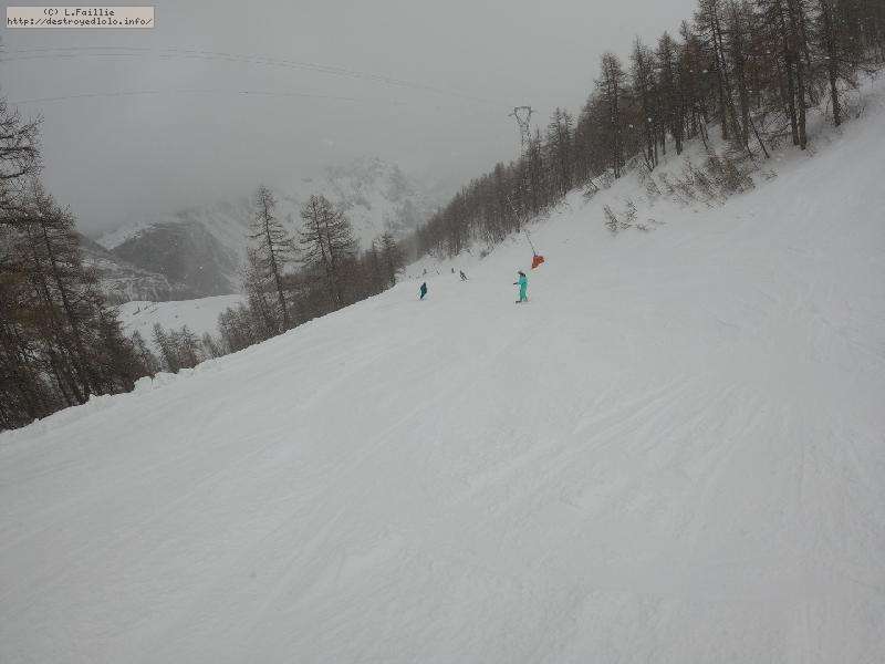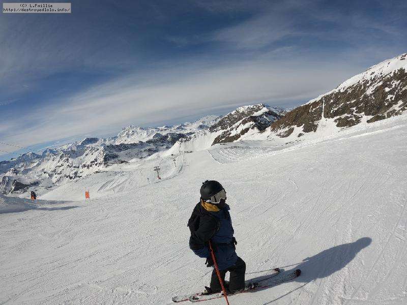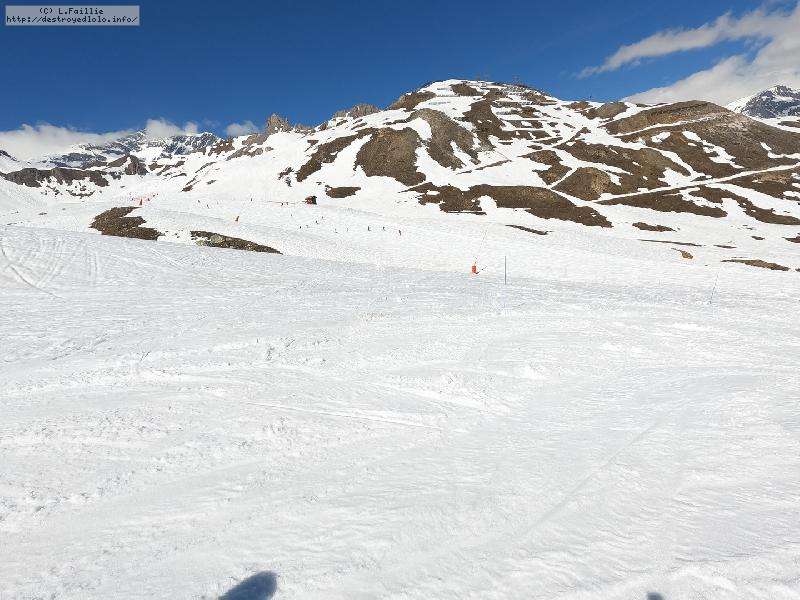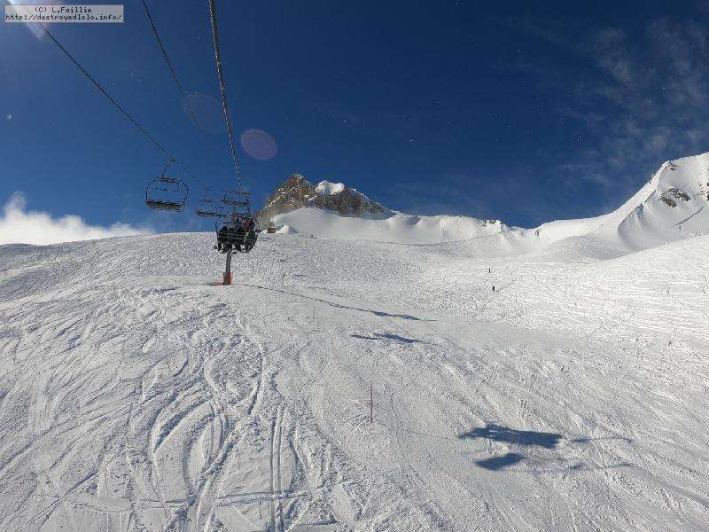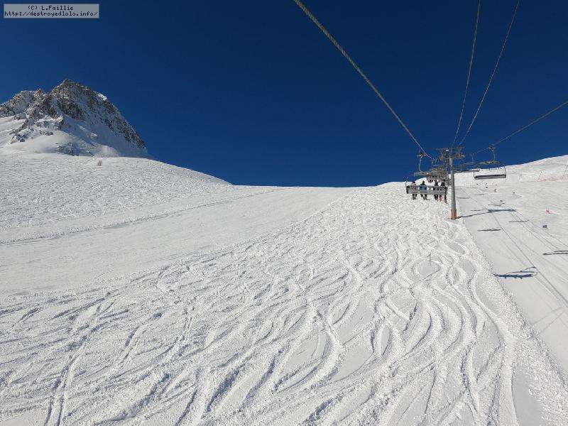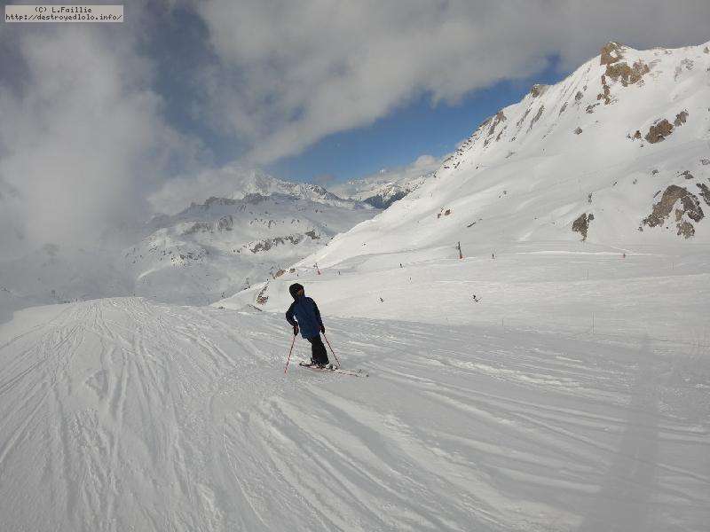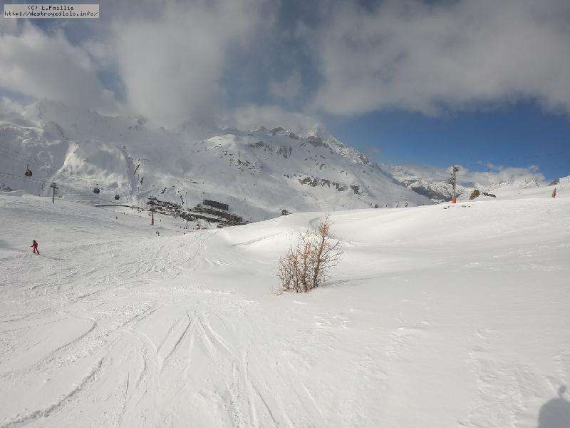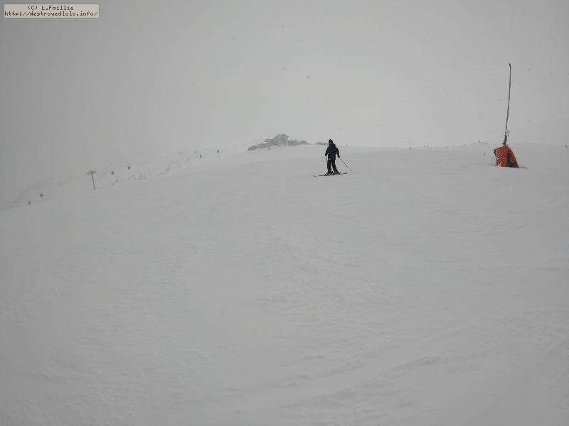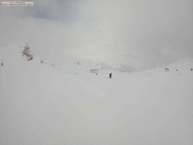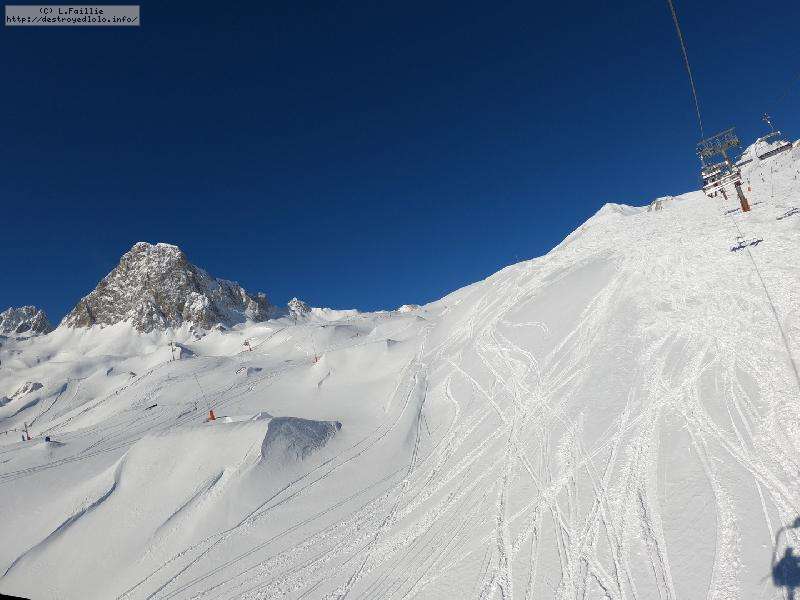 Enfin le vent se calme : le glacer ouvre ... sauf que vu le monde, on fera l'impasse : pas envie d'attendre 40 minutes alors qu'il n'est même pas possible de profiter des hors-piste vu que les ratraks ont tout massacré. On descend donc pas Génépi (quel beau nom quand même) pour basculer sur Val d-Isère.