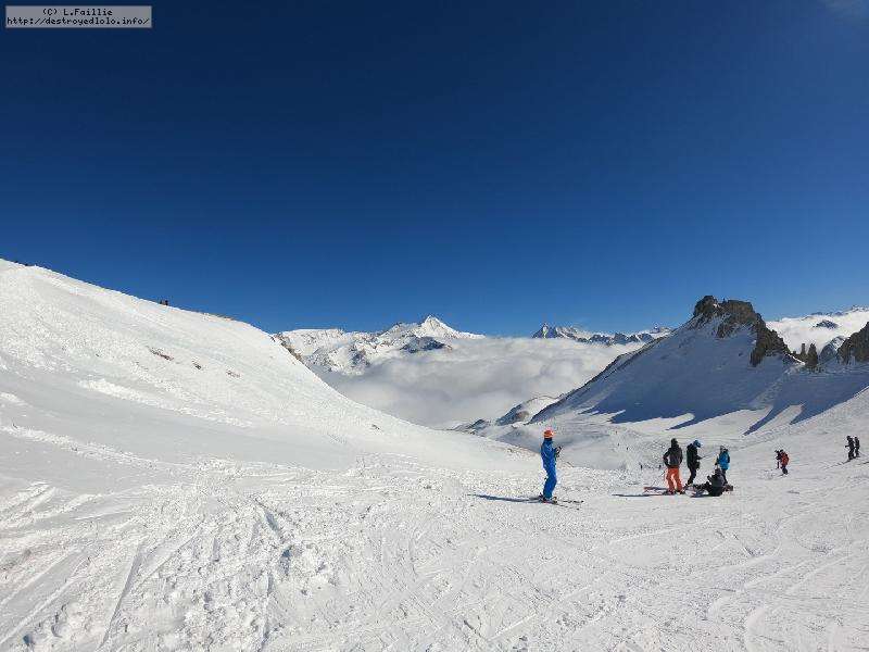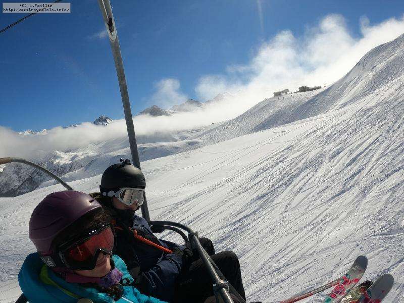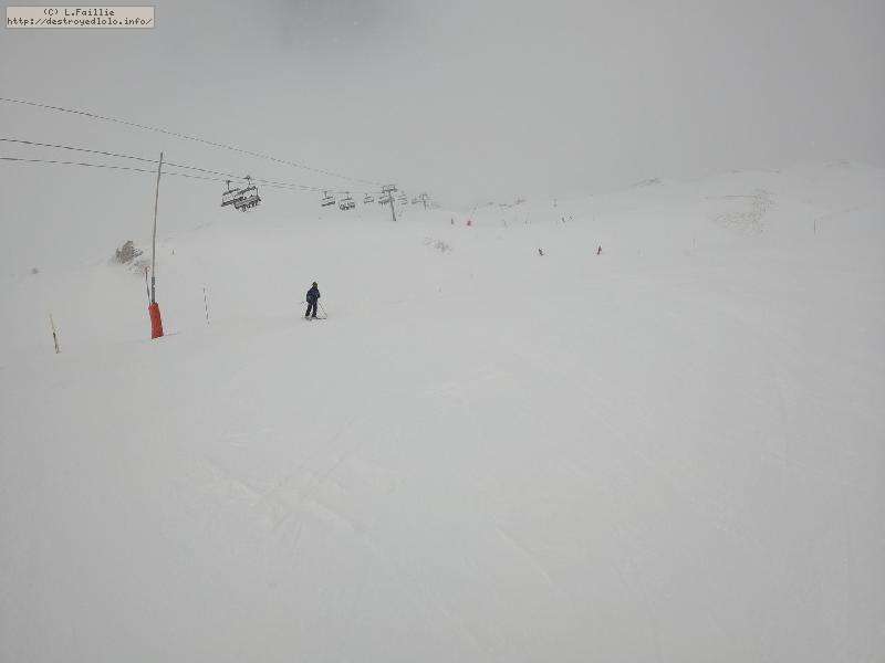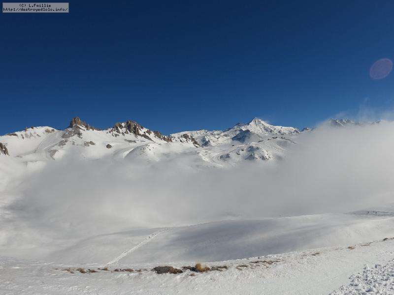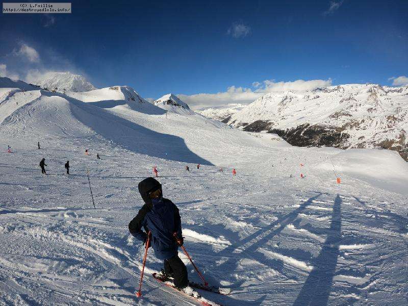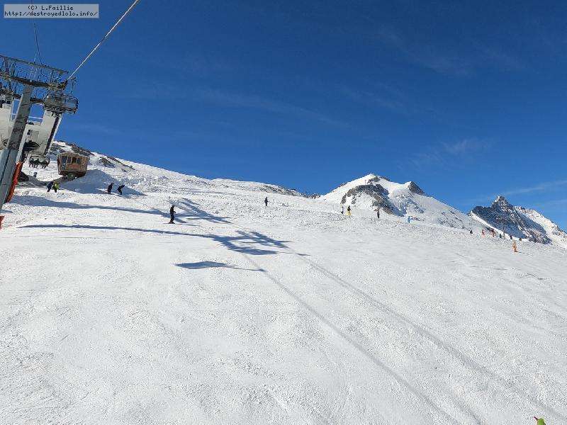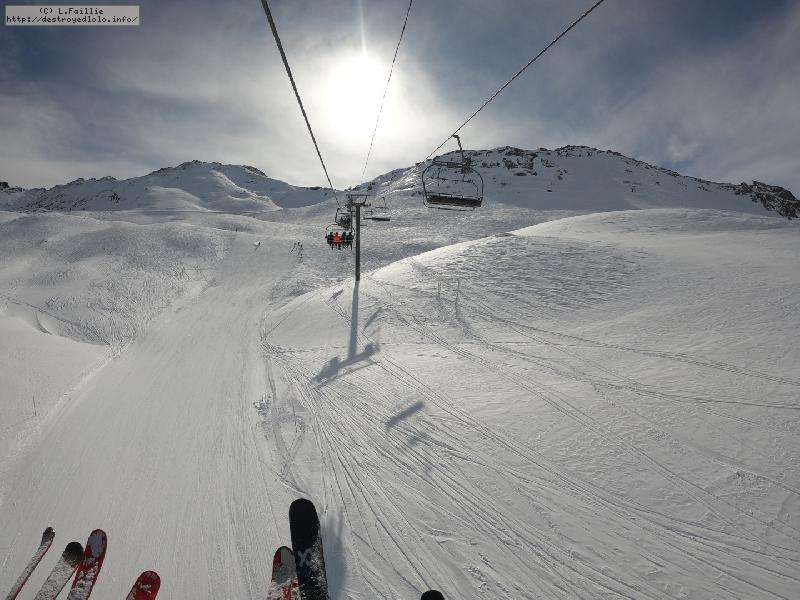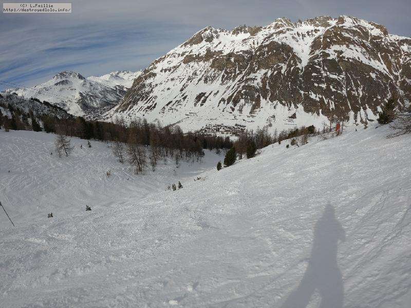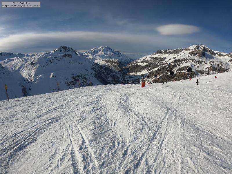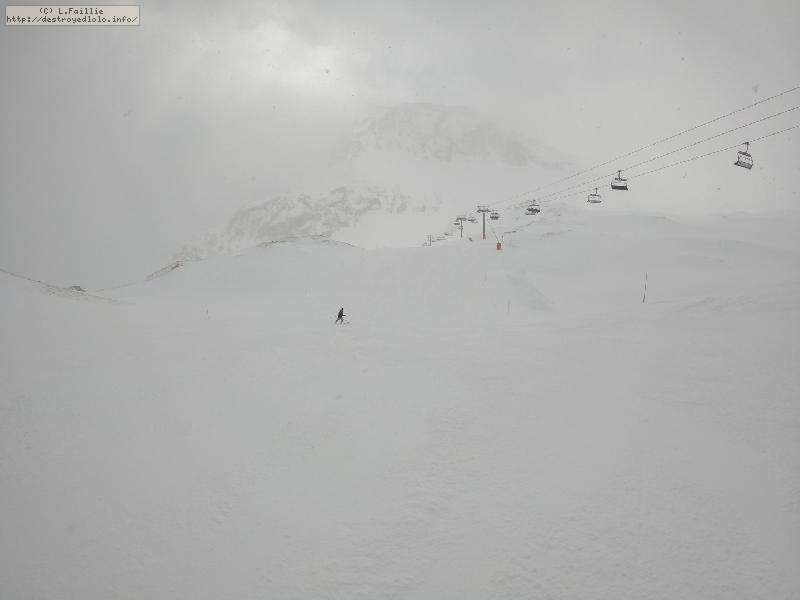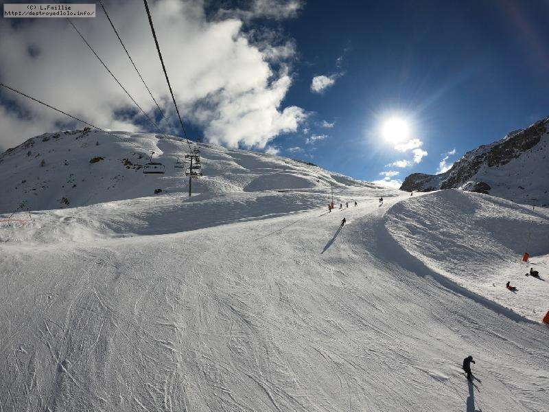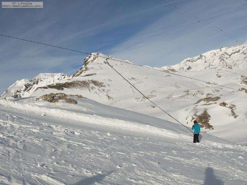 Enfin le vent se calme : le glacer ouvre ... sauf que vu le monde, on fera l'impasse : pas envie d'attendre 40 minutes alors qu'il n'est même pas possible de profiter des hors-piste vu que les ratraks ont tout massacré. On descend donc pas Génépi (quel beau nom quand même) pour basculer sur Val d-Isère.