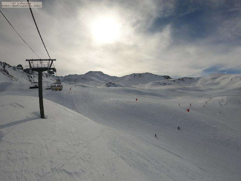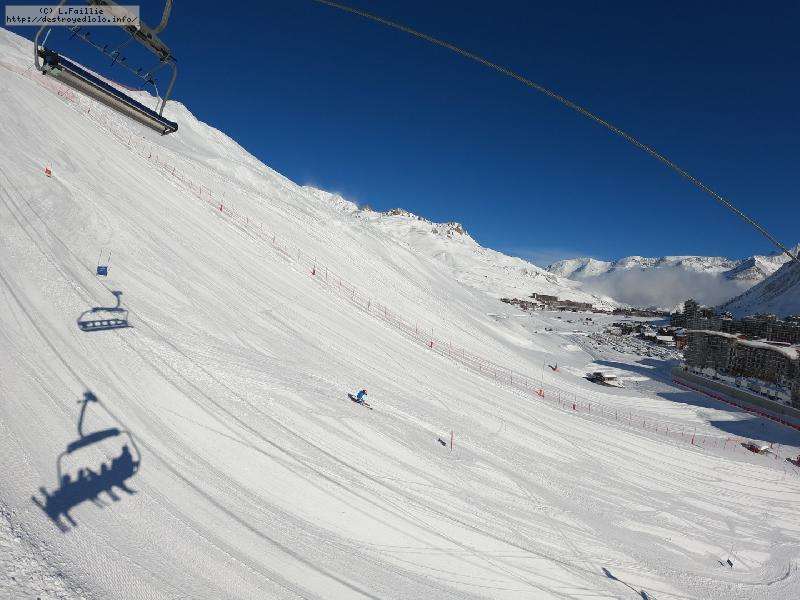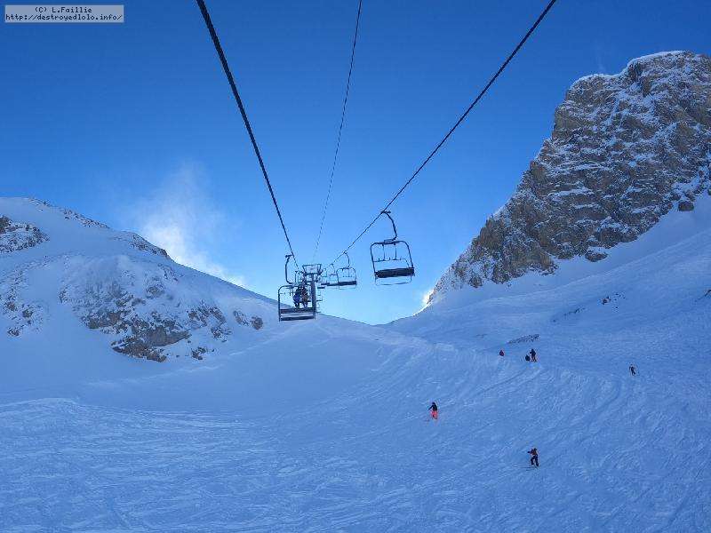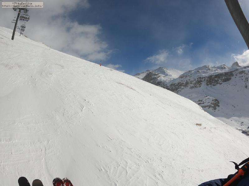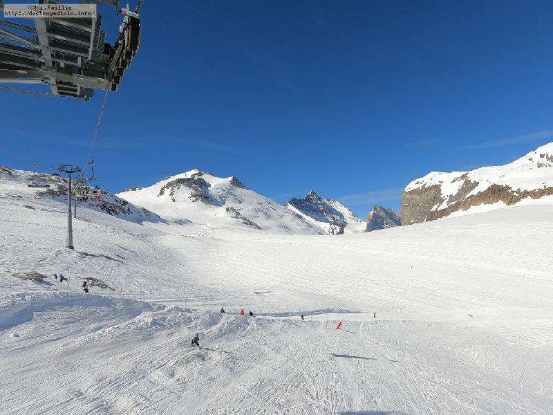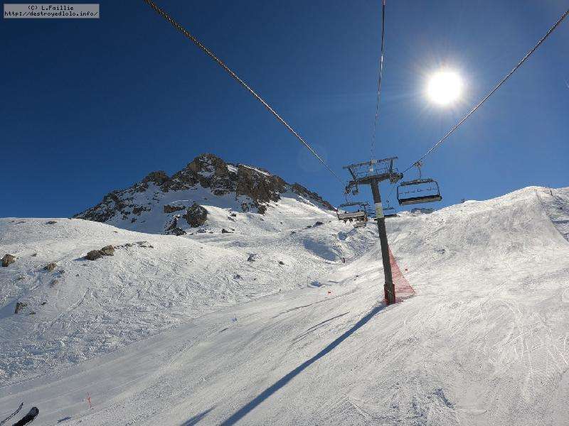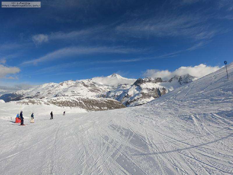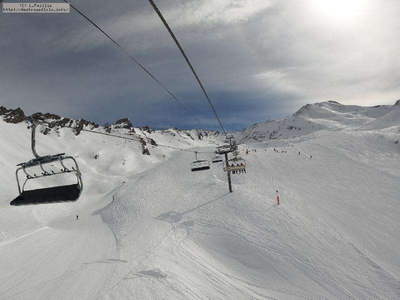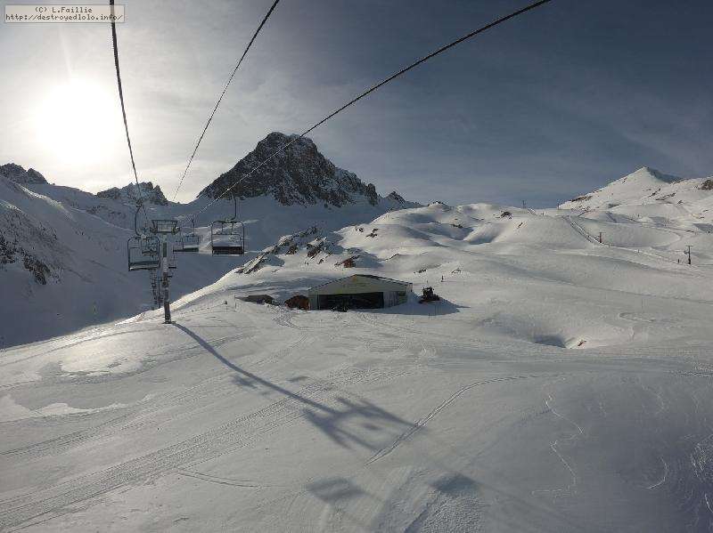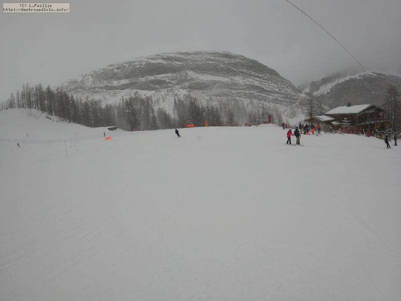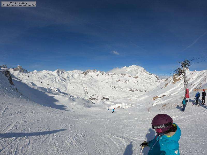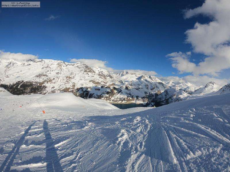 Enfin le vent se calme : le glacer ouvre ... sauf que vu le monde, on fera l'impasse : pas envie d'attendre 40 minutes alors qu'il n'est même pas possible de profiter des hors-piste vu que les ratraks ont tout massacré. On descend donc pas Génépi (quel beau nom quand même) pour basculer sur Val d-Isère.