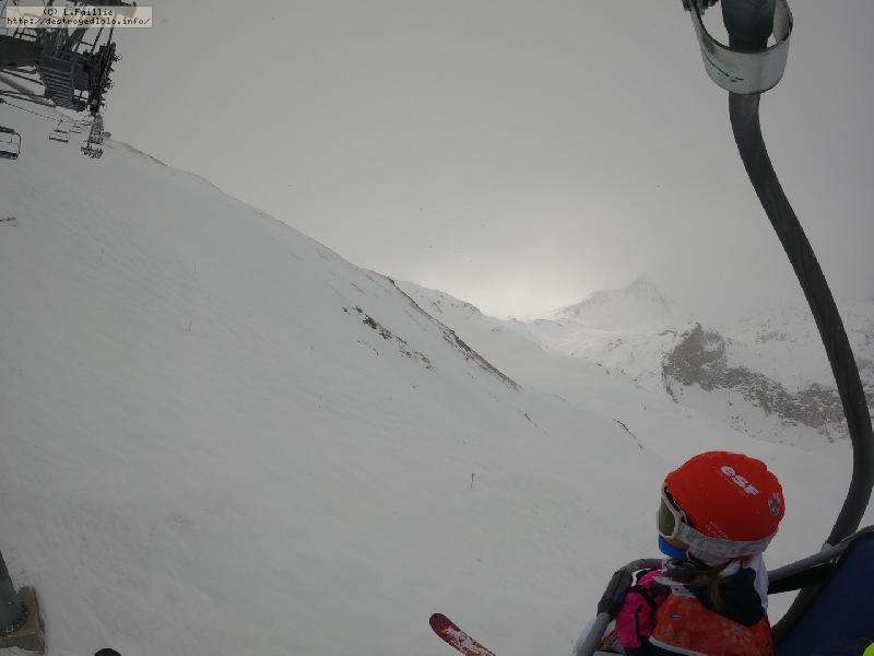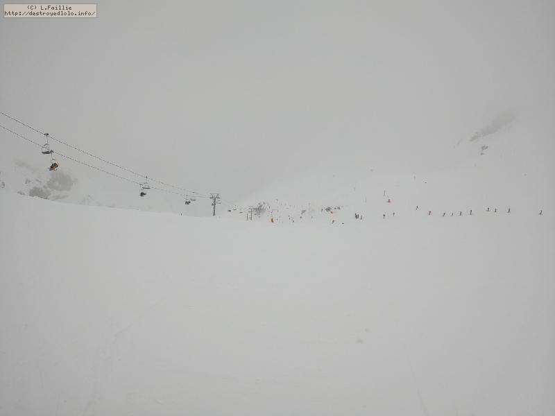 Radio Tignes nous promet "une belle journée même si le matin serait un peu chargé en nuage d'altitude" ... ben l'a météo s'est un peu gouré : il va neiger à gros flocons jusqu'au milieu de l'après-midi avec jour blanc.