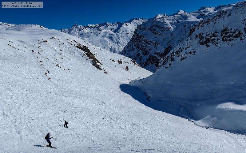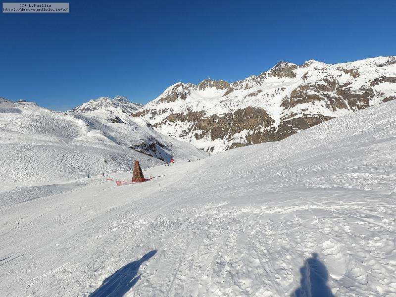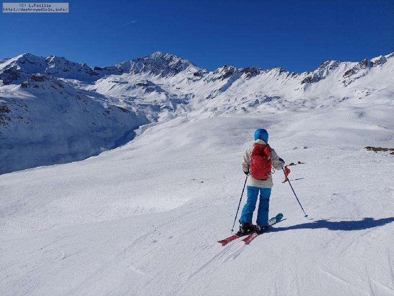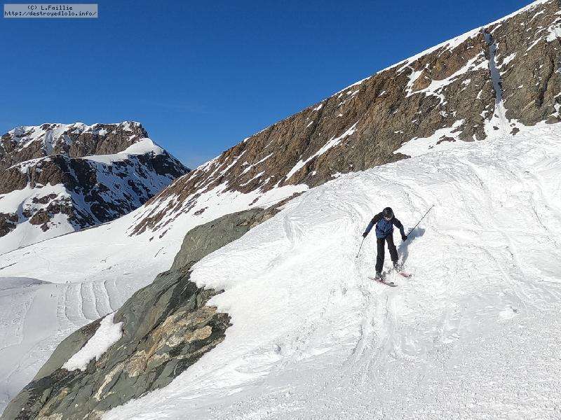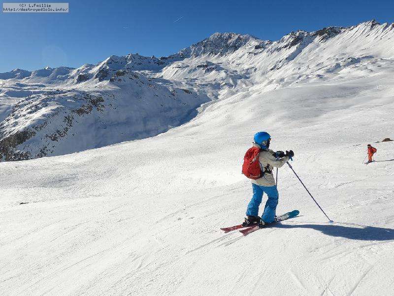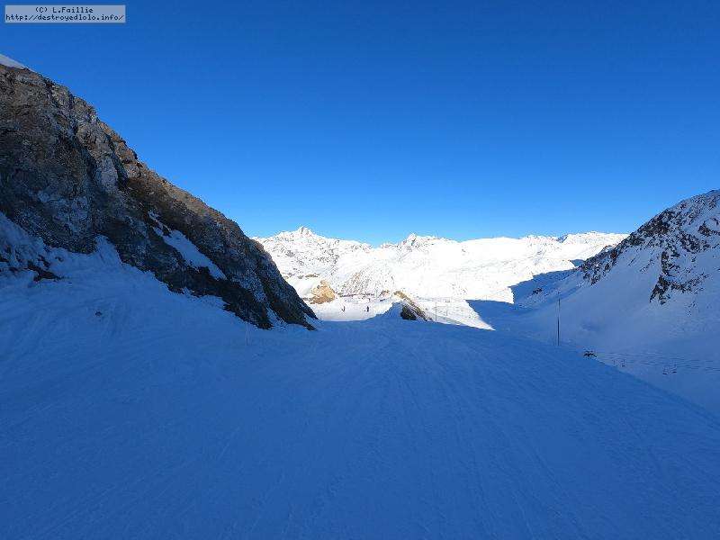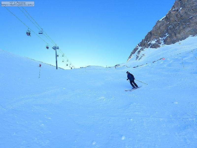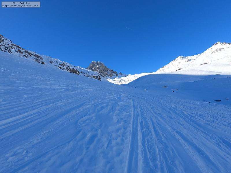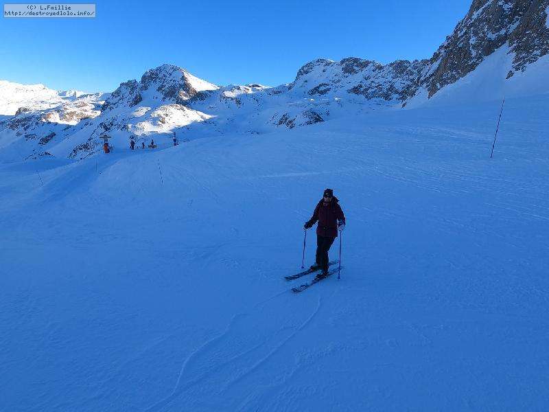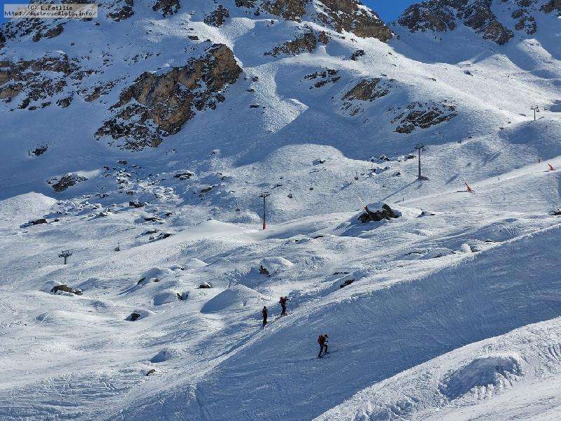 Direction Tignes le Lac en passant par la comble folle : malheureusement par les pistes, car, trop exposé, le hors piste n'est que grattons indigestes et beaucoup trop de cailloux. La vertigineuse noire qui suit n'est qu'une vaste patinoire comme à son habitude ... mais permet d'atteindre l'aiguille Persée puis on revient sur la valeur sûre : le col des Ves, excellent bien sûr !