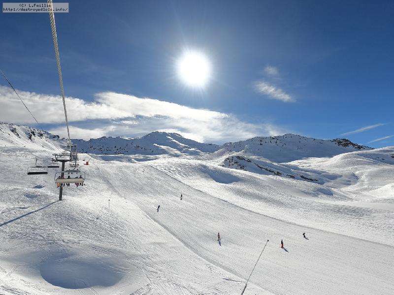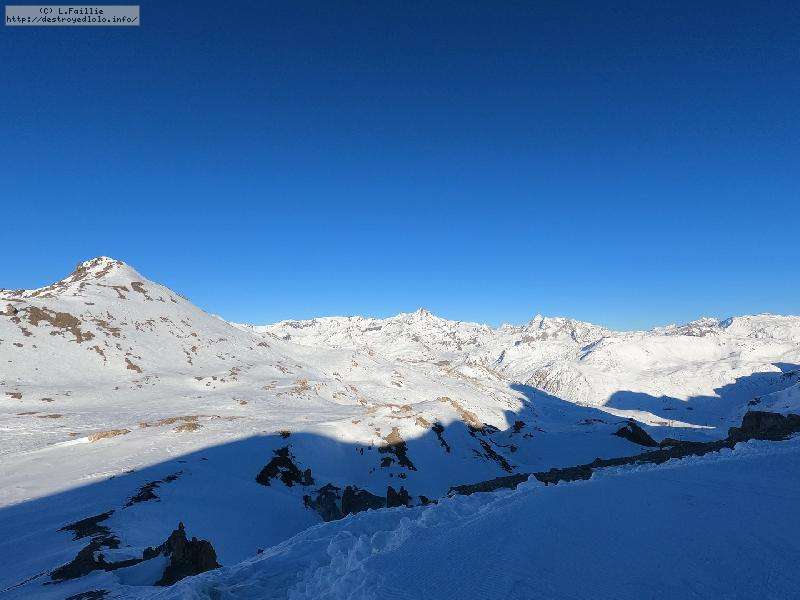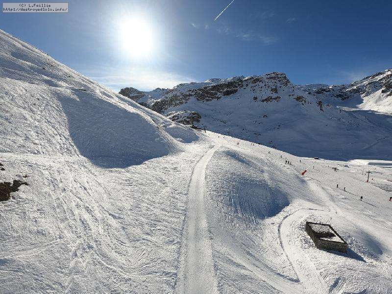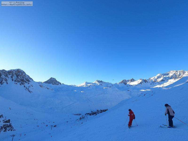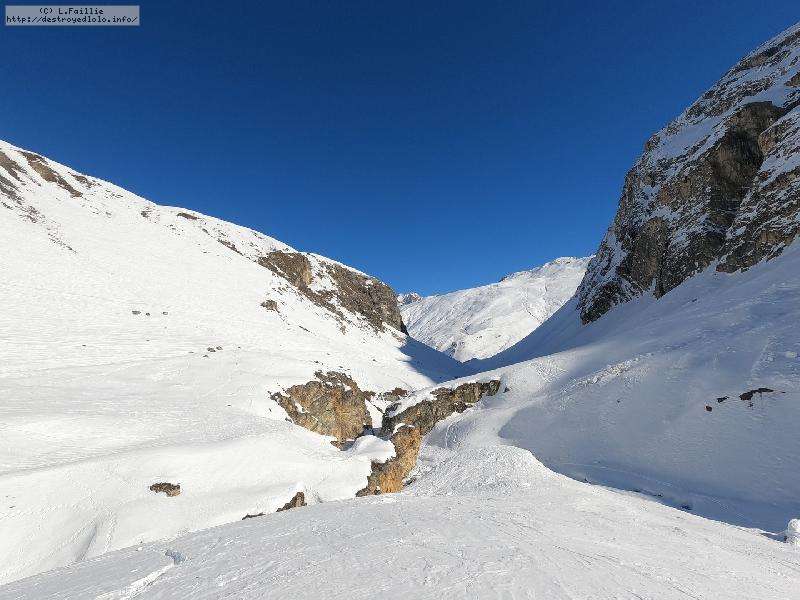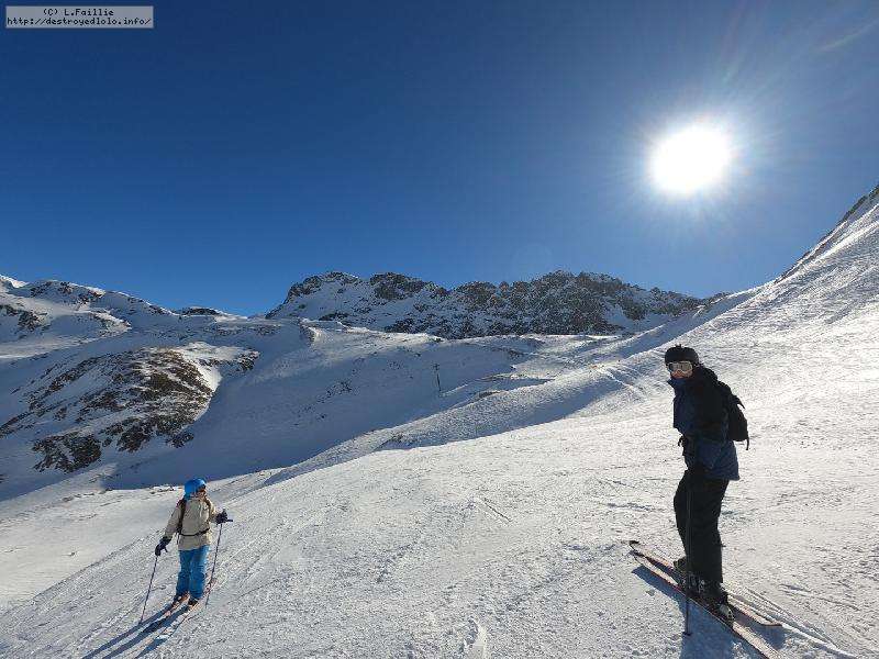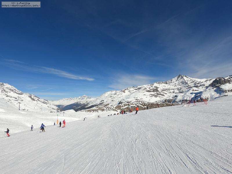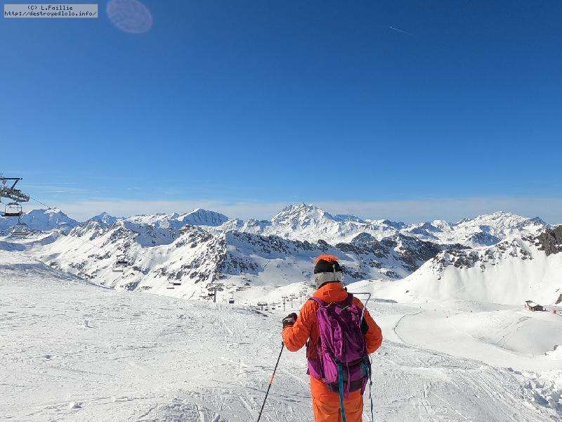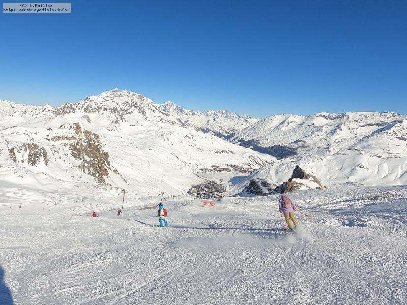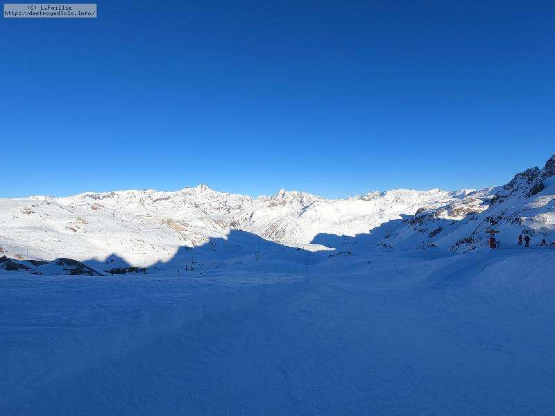 Direction Tignes le Lac en passant par la comble folle : malheureusement par les pistes, car, trop exposé, le hors piste n'est que grattons indigestes et beaucoup trop de cailloux. La vertigineuse noire qui suit n'est qu'une vaste patinoire comme à son habitude ... mais permet d'atteindre l'aiguille Persée puis on revient sur la valeur sûre : le col des Ves, excellent bien sûr !