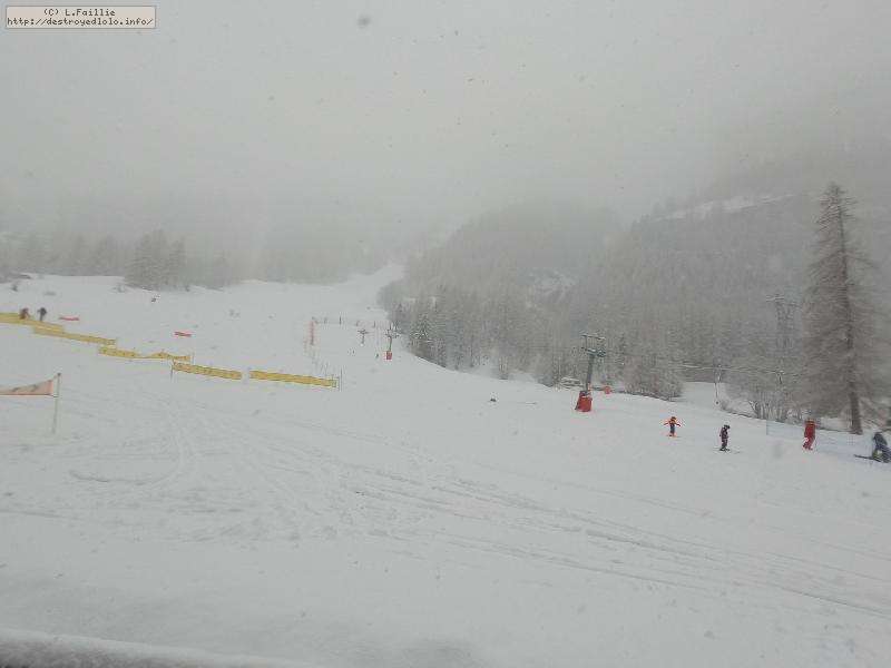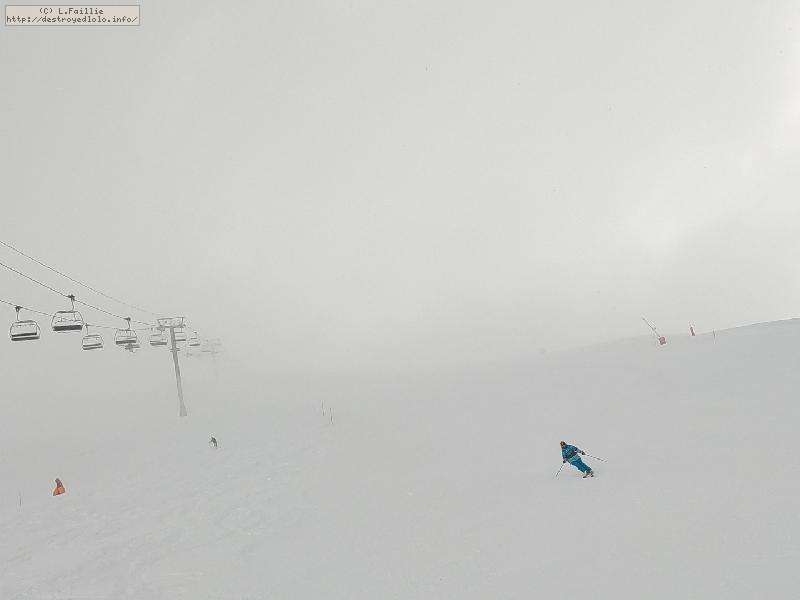A nouveau, météo peu avenante : neige mouillée à l'arrivée aux Brévières (qui se transformera vite en gros VRAIS flocons), brouillard à tous les étages et surtout un vent tempétueux prévu dès la mi-journée. Ben les prévisions étaient justes et les pistes du haut fermes les unes après les autres ... mais souvent, nous ferons la "fermeture". Puis surtout, on n' y voit QUE DAL !
