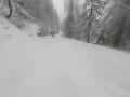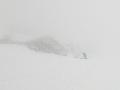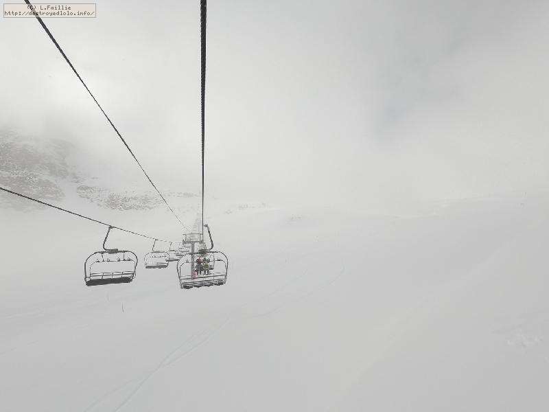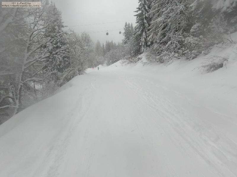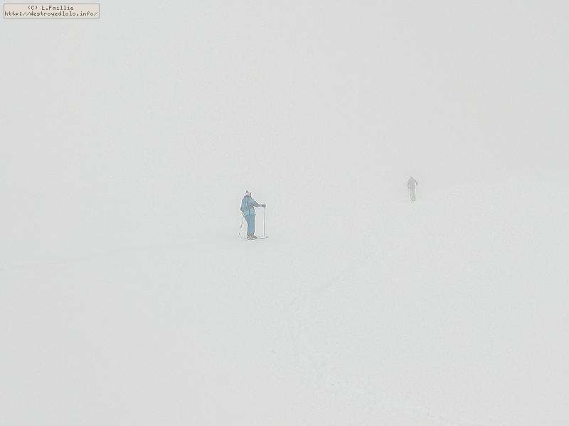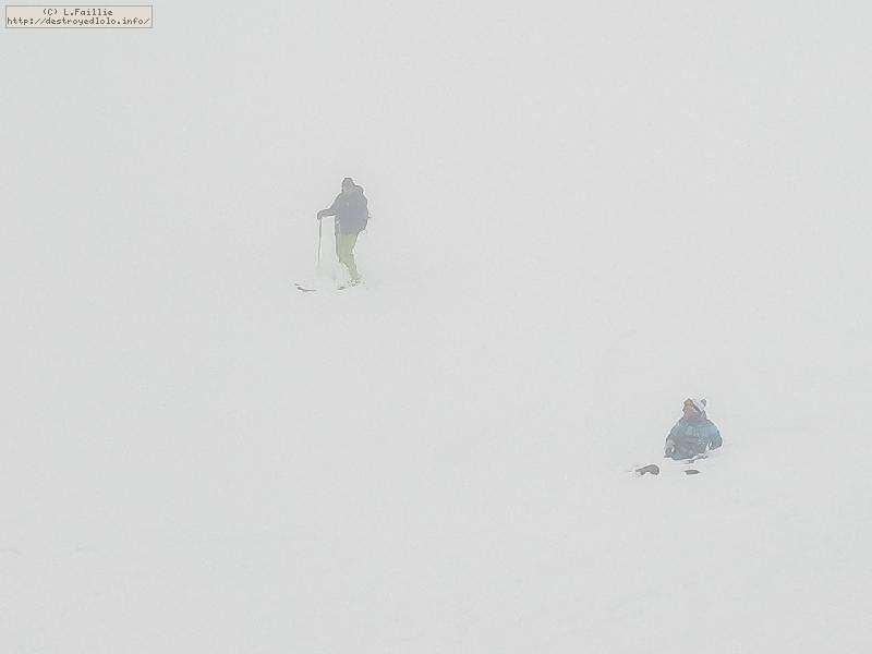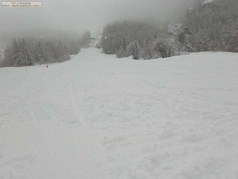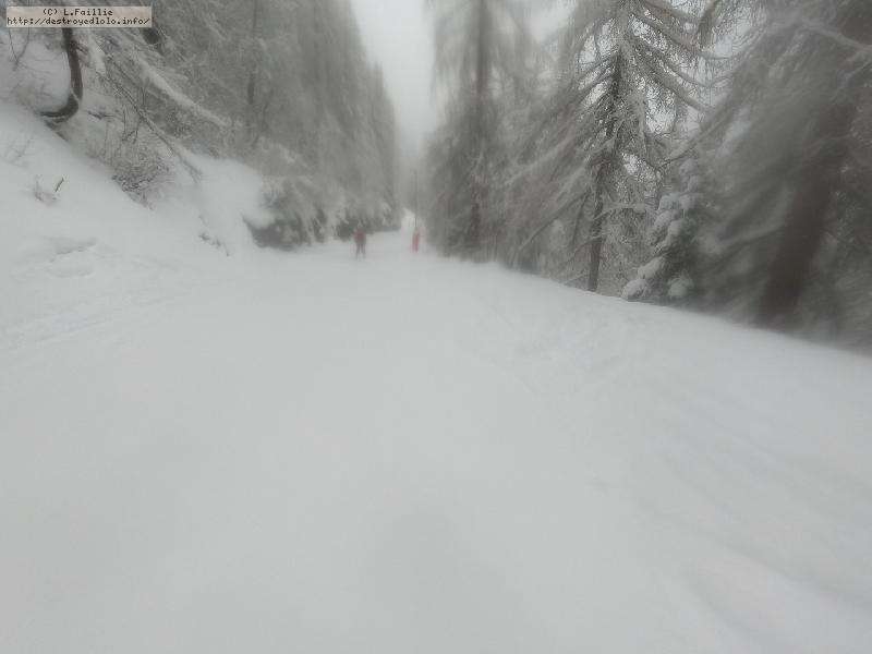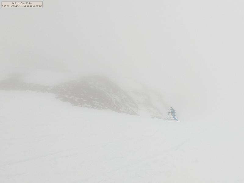 Heureusement qu'il y a une couche énorme de fraîche, car manque de visibilité aidant, j'irai plusieurs fois à la faute dont une super chute d'au moins 4 m (ben ouai, je pensais que ca passerait entre les 2 pistes ... sauf qu'il y avait un trou !).
