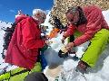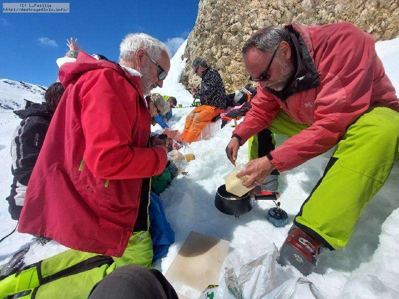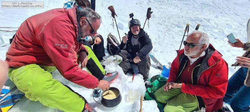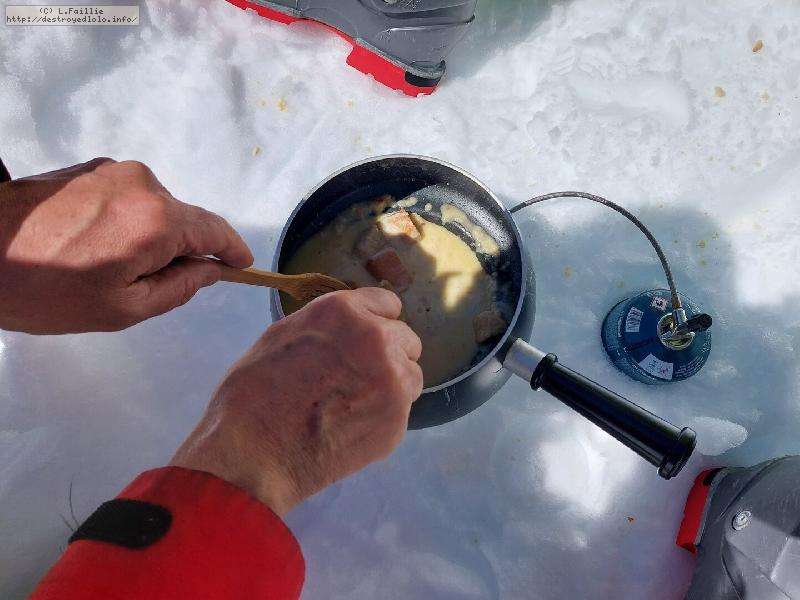 Il est temps de manger : place à la fondue ... au milieu des pistes !!! Elle se fera à l'abri du vent dans un petit vallon sur l’intérieur du géant, héhé.
