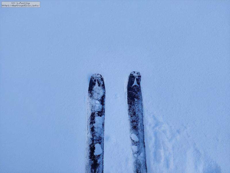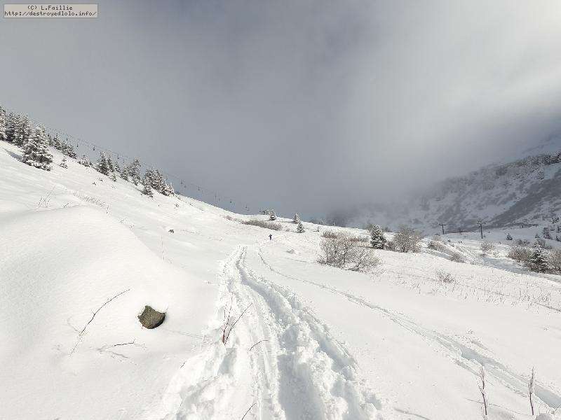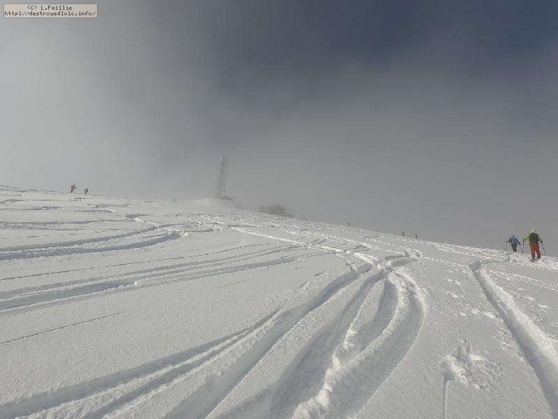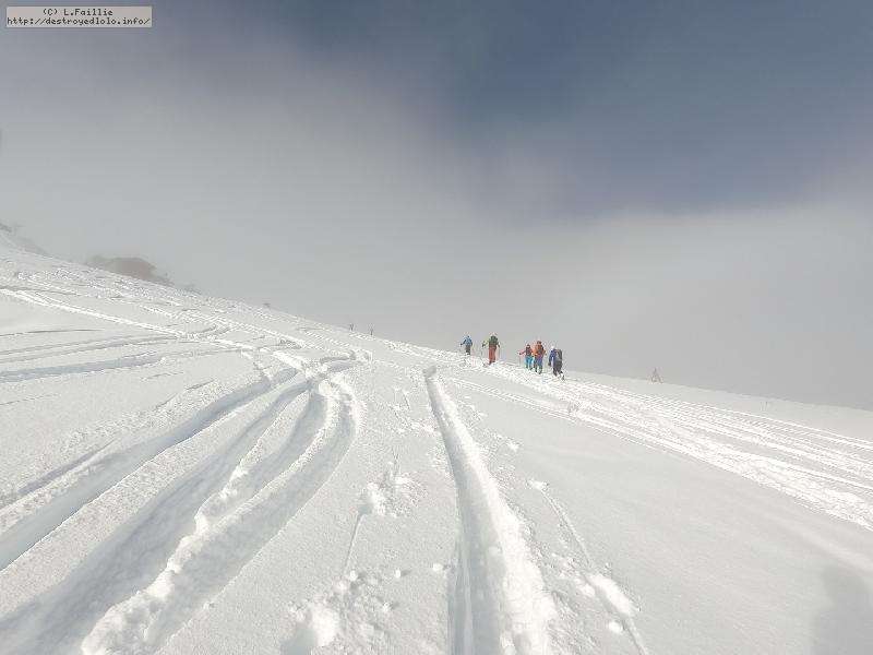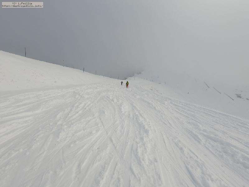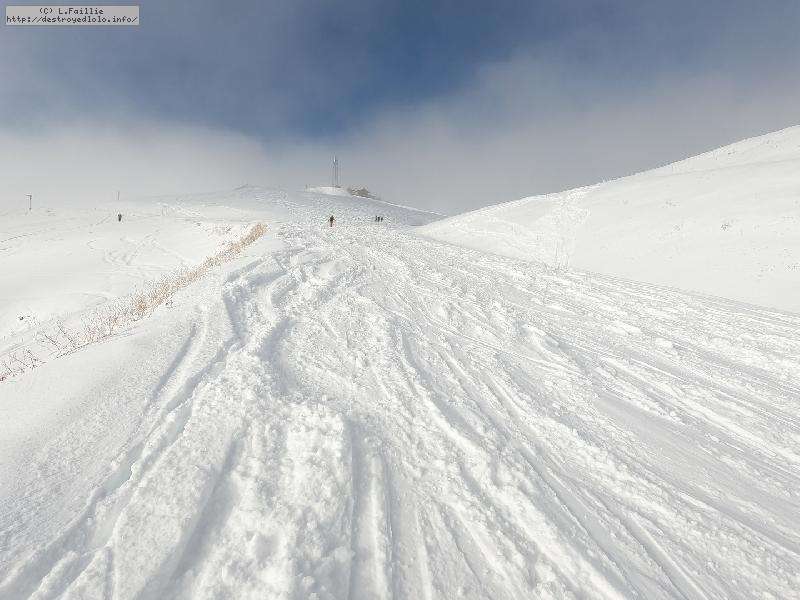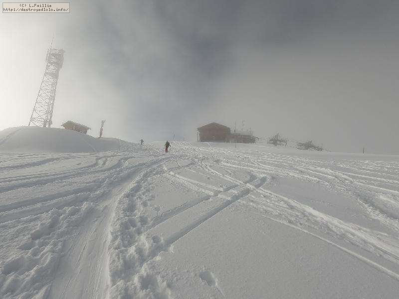 Las ... si la peuf est bien là, on n'y voit strictement rien : le temps de se sustenter, les nuages se sont accrochés. Par sécurité, on redescend par la bleu plutôt que de profité d'une noire immaculée ...