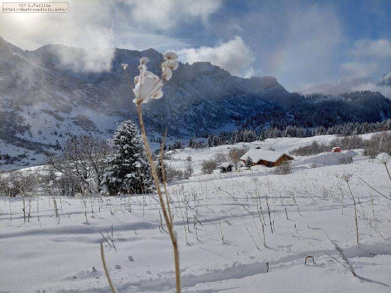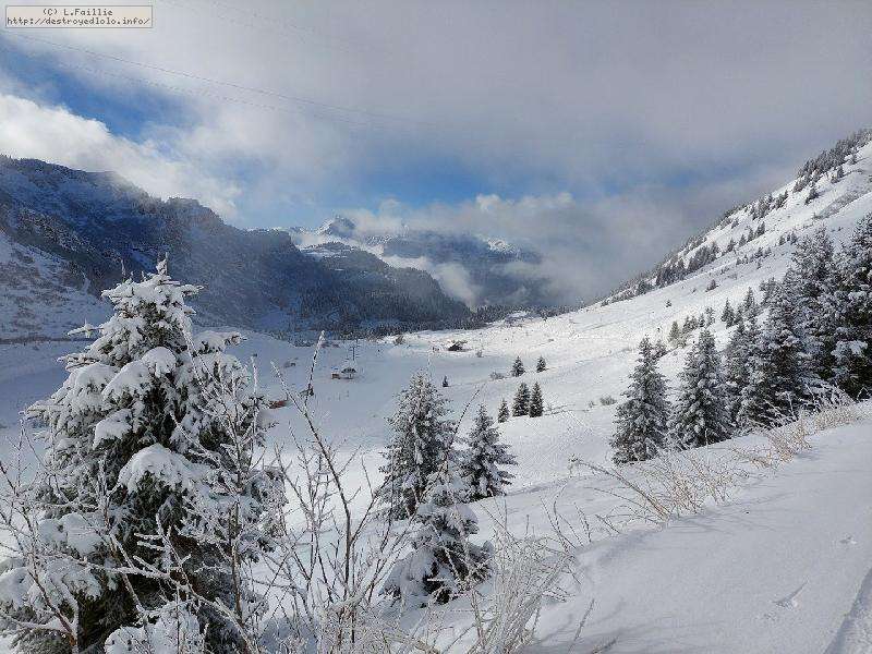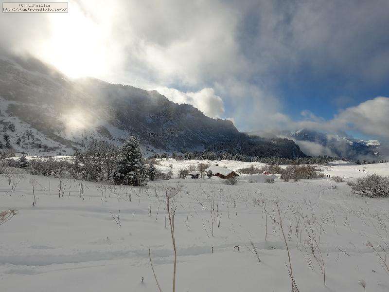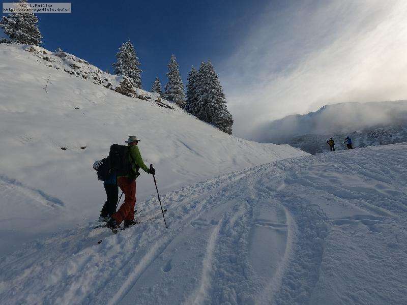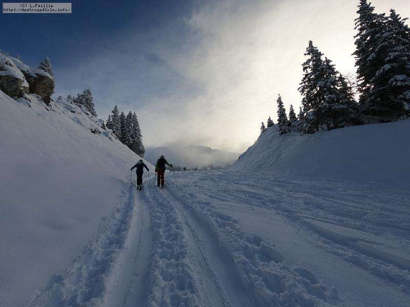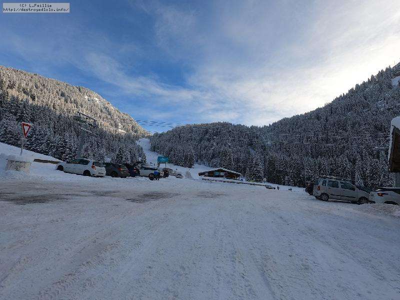 Ça a plâtré aux Carroz, ça a énormément plâtré ... et pas une dameuse à l'horizon : ça s'annonce bien ! Nous ne sommes pas tout seuls à notre point de départ, le parking des Molliets.