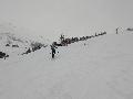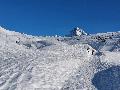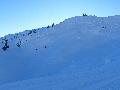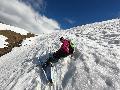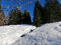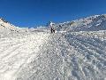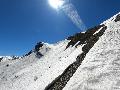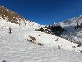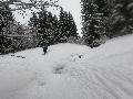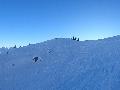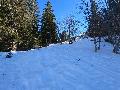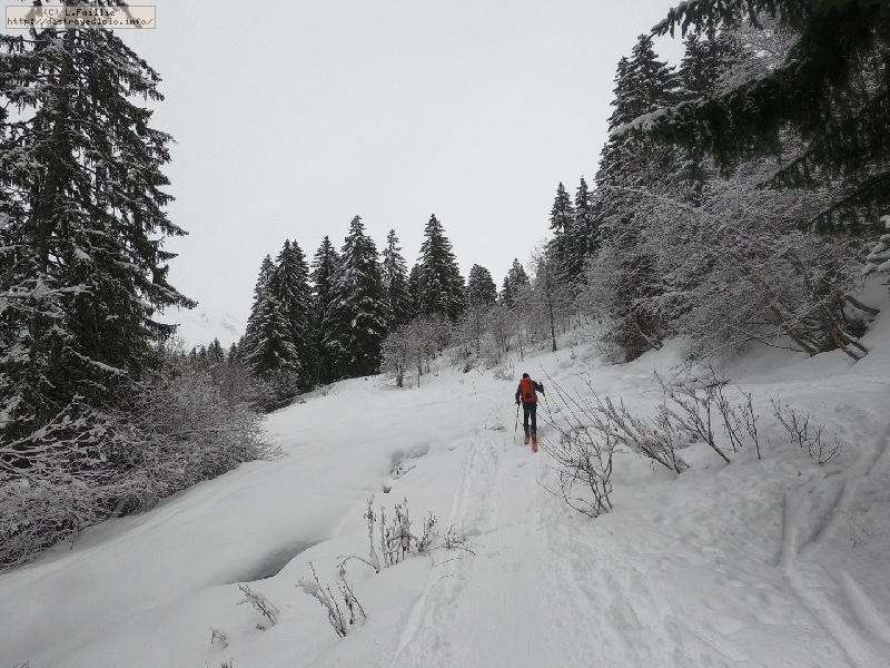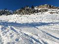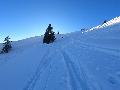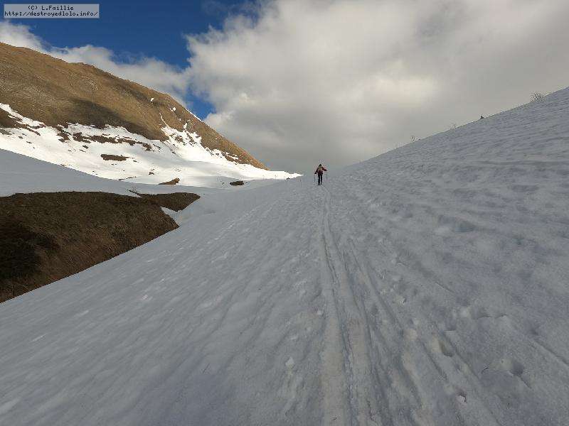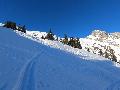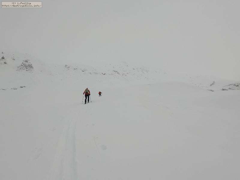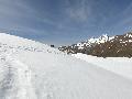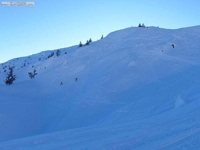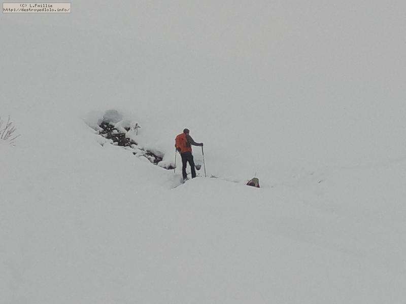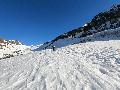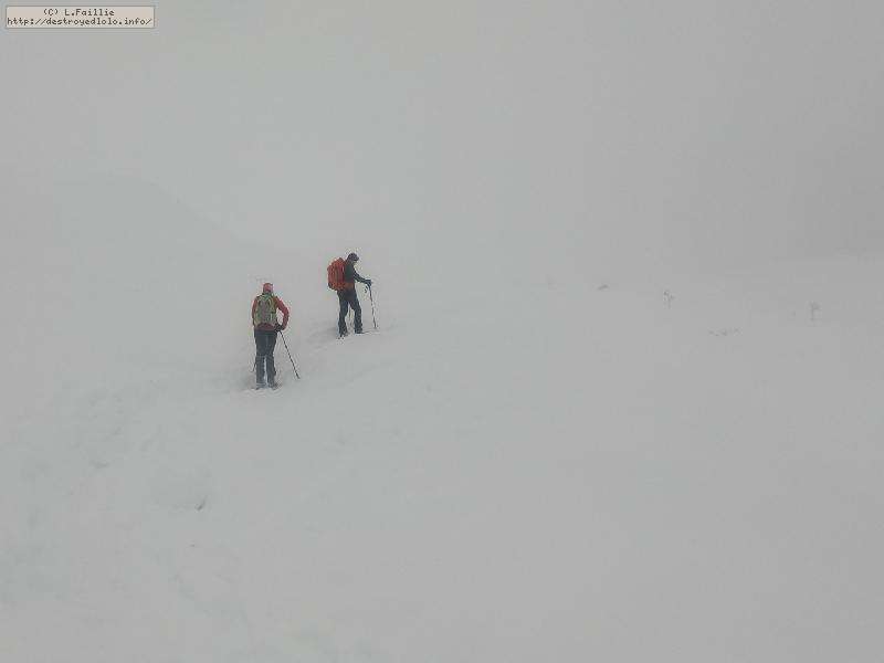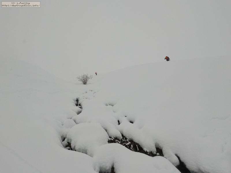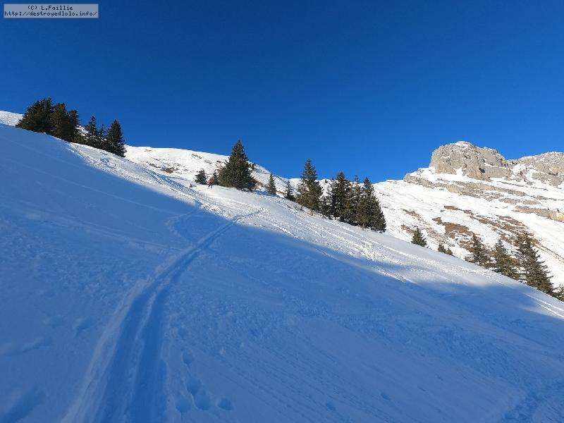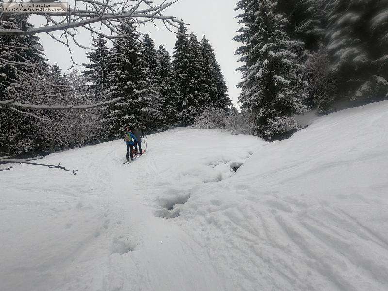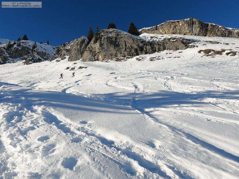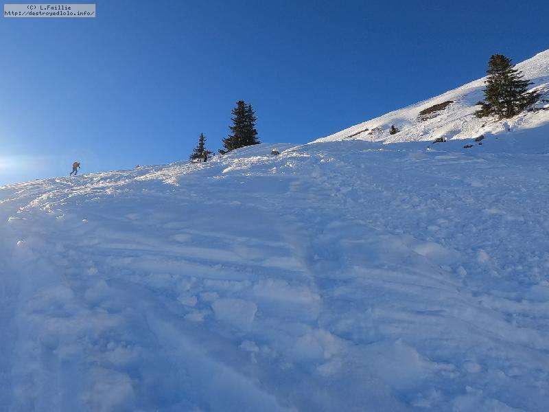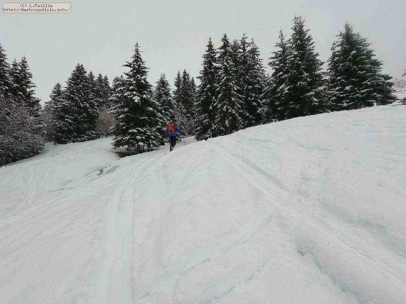 Dès qu'on s'élève, la neige devient abondante, voire peuffienne ... si l'on prend soins d'éviter les pentes les plus exposées. Ce coup-ci, nous ne prenons pas l'itinéraire classique, mais plus à gauche, plus raide, vers les falaises. Mais une excellente peuf nous attend sur le dessus.