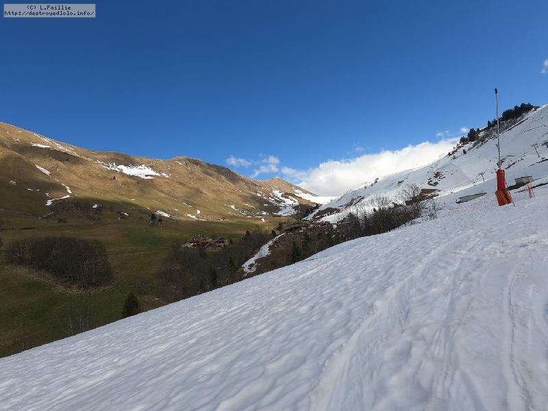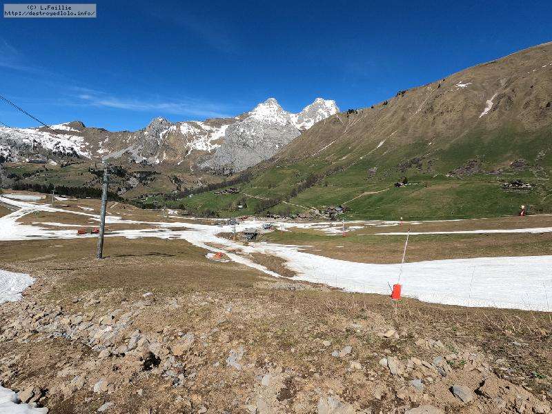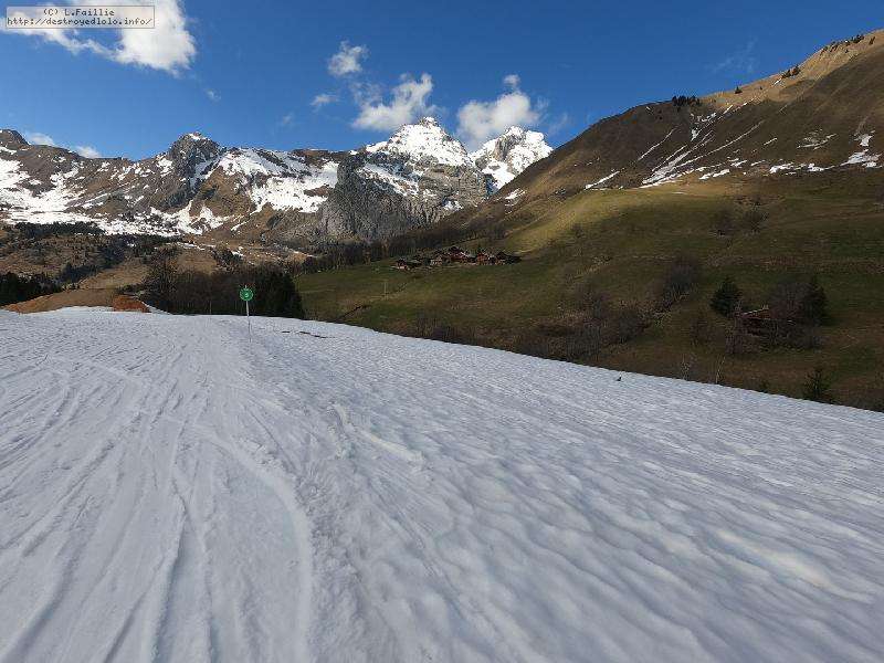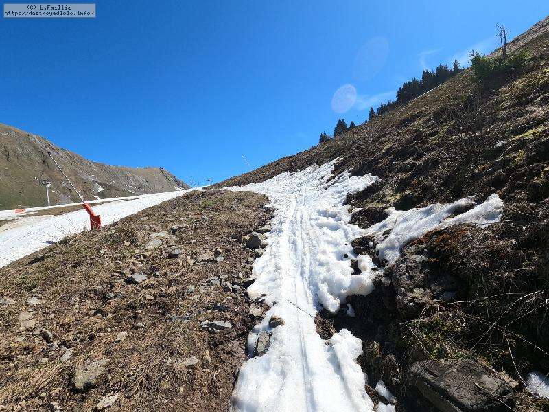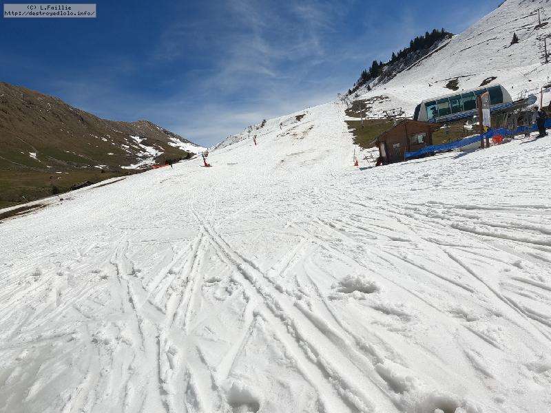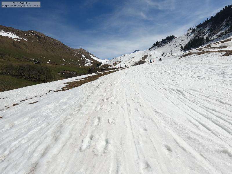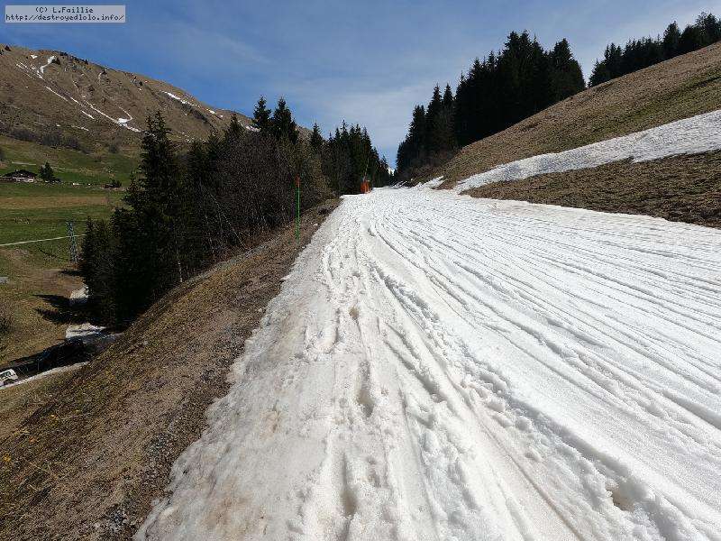 26° au Chinallion, ça sera évidemment de la soupe partout, mais pas si mal que ça. Et malgré les plaques de terre qui apparait de plus en plus (surtout sur les pistes), il reste quand même une belle couche qui laisse un peu d'espoir pour continuer à sortir les peaux un peu de temps. Mais des que la station fermera et que les dameuses ne passeront plus, il faudra sans doute porter jusqu'au Maroly.