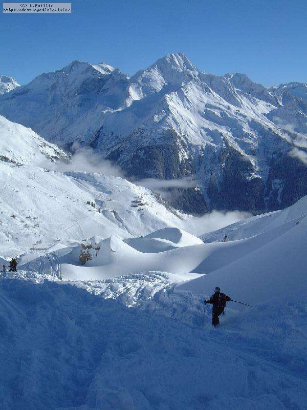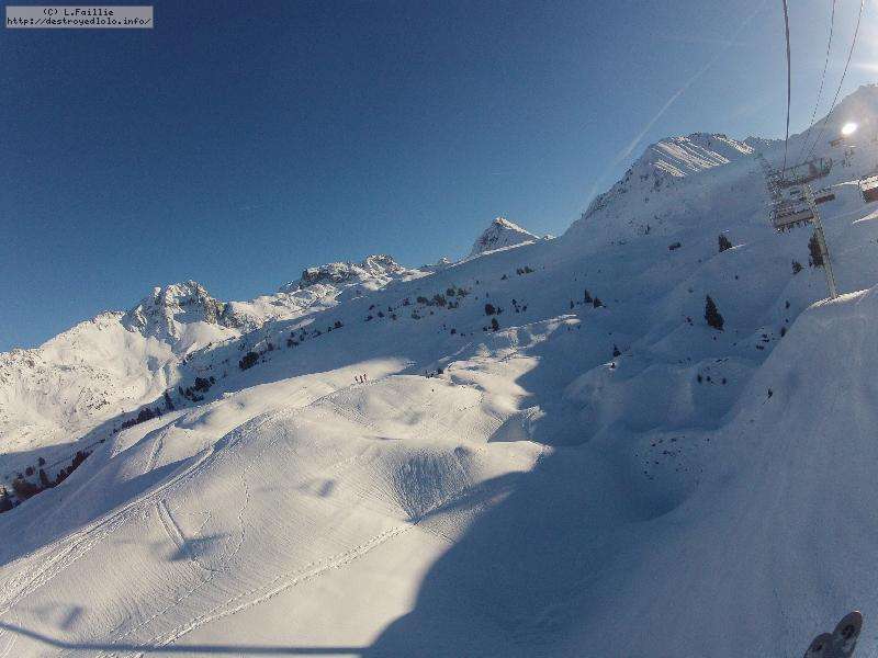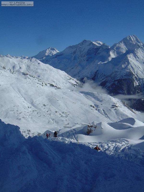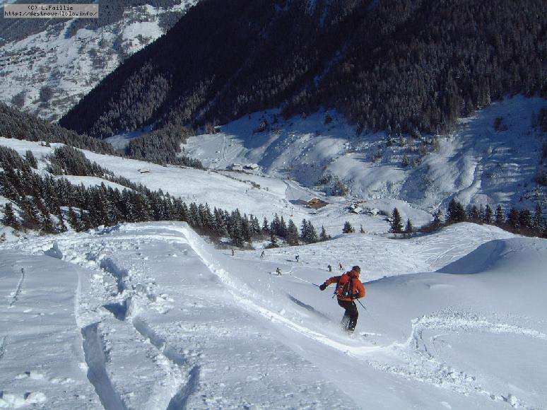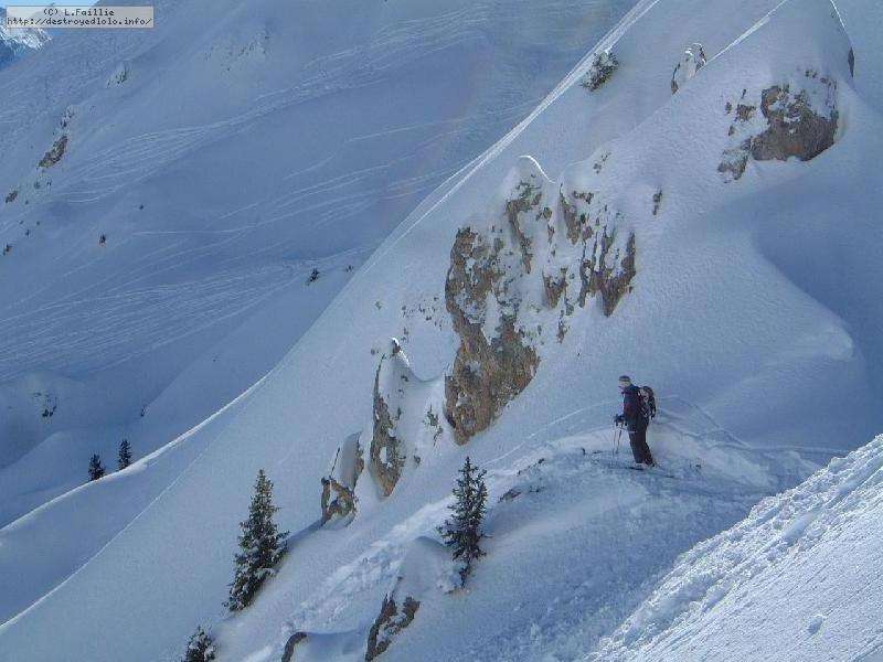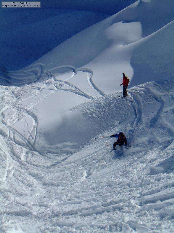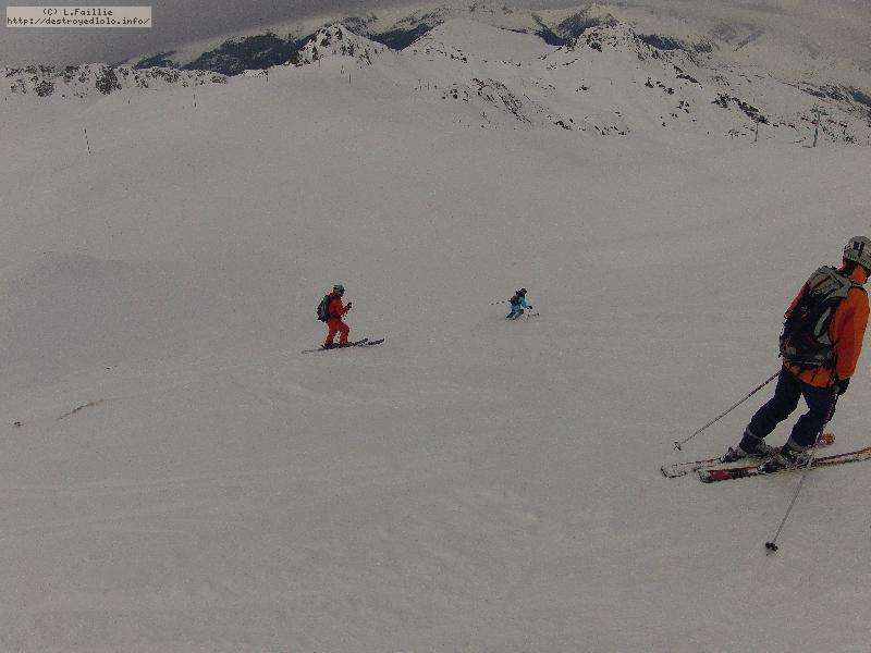 Le meilleur moment restera la liaison hors piste entre le bas de du télésiège du « Chalet de Bellecôte » et le bas de la piste des « crozats » oú Manu, Gé et Seb se risquent dans un goulet bien glacée ...