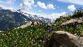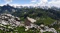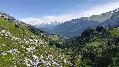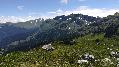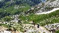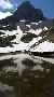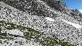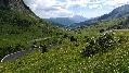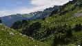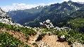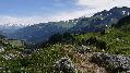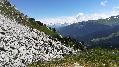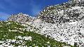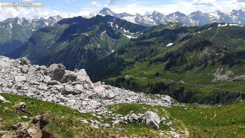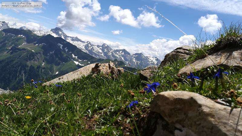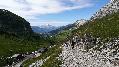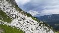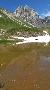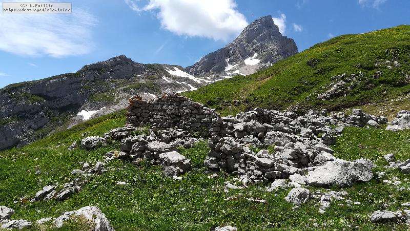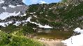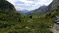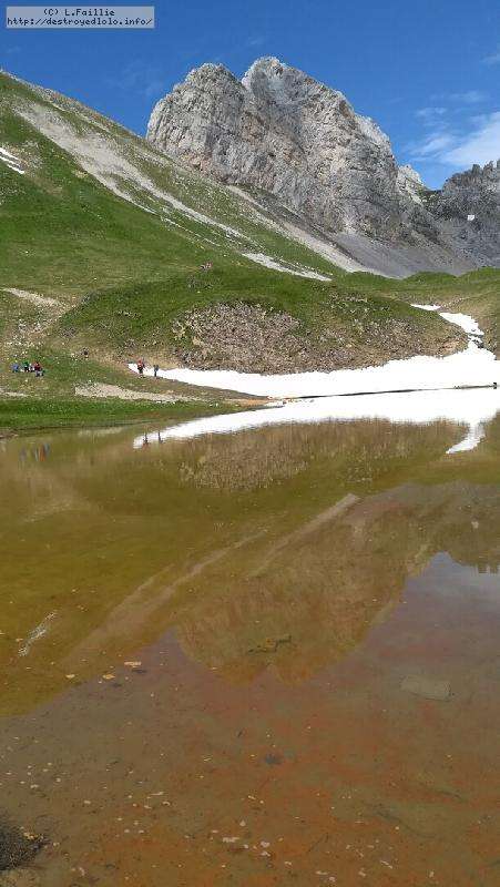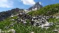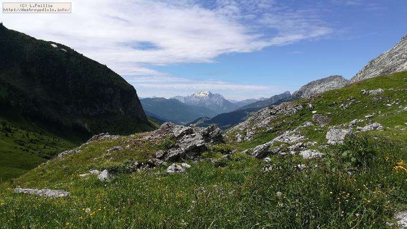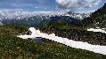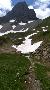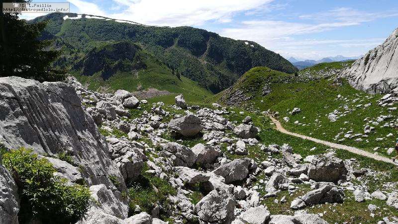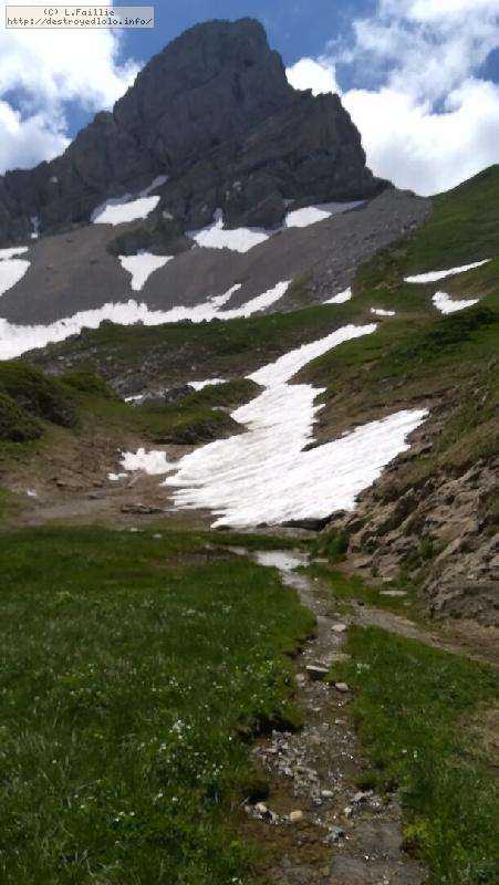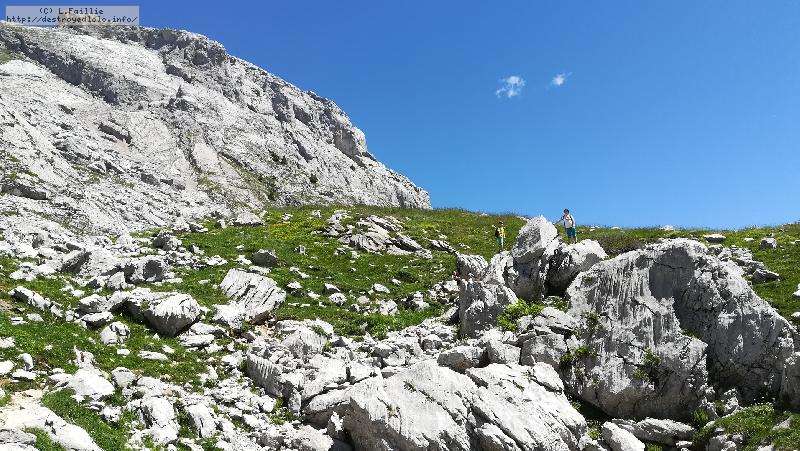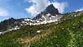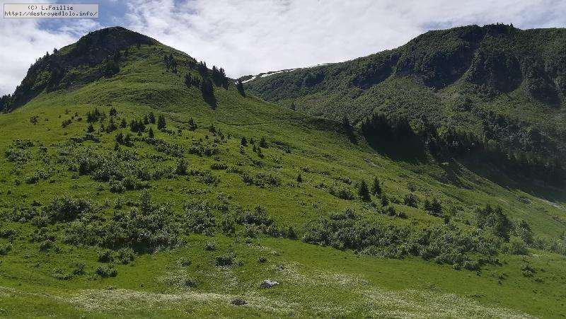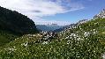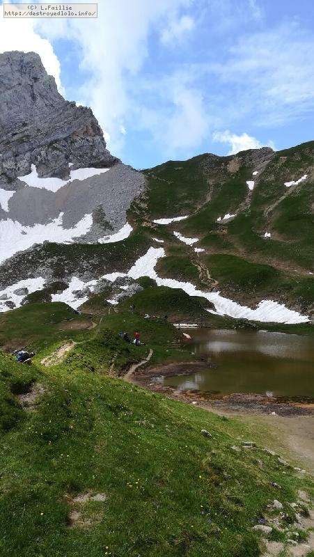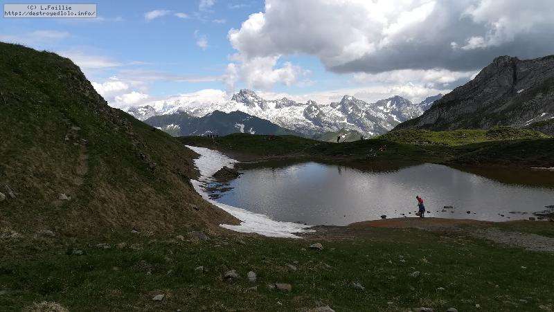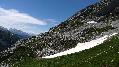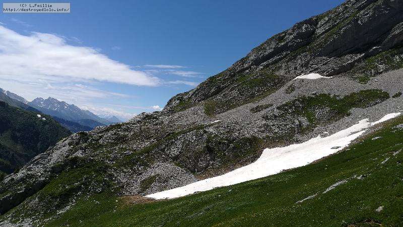 Le lac est en contrebas, dans un écrin minéral, de pâturages et de quelques névés.
